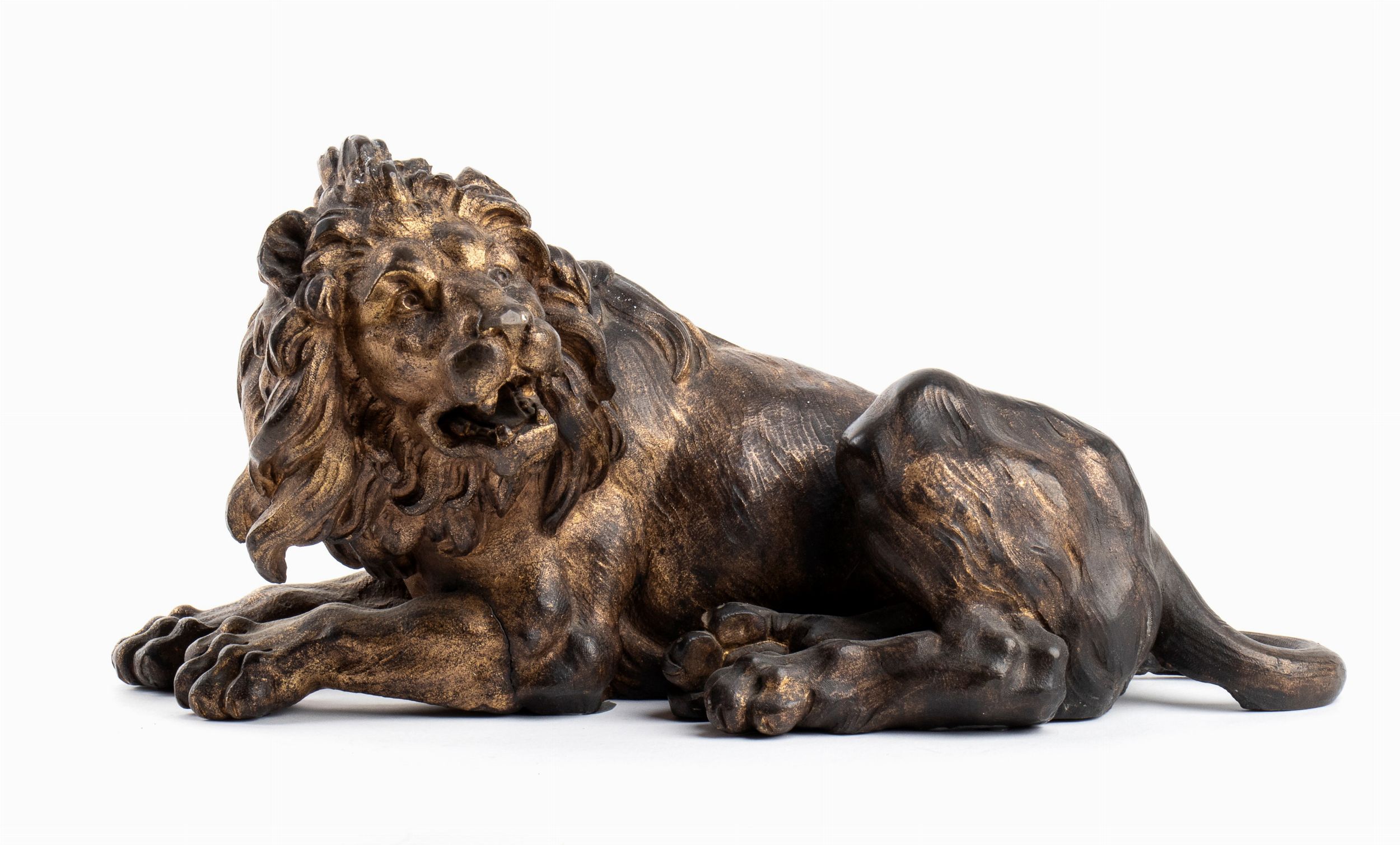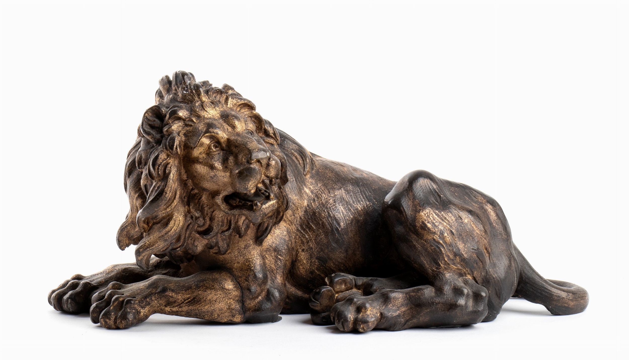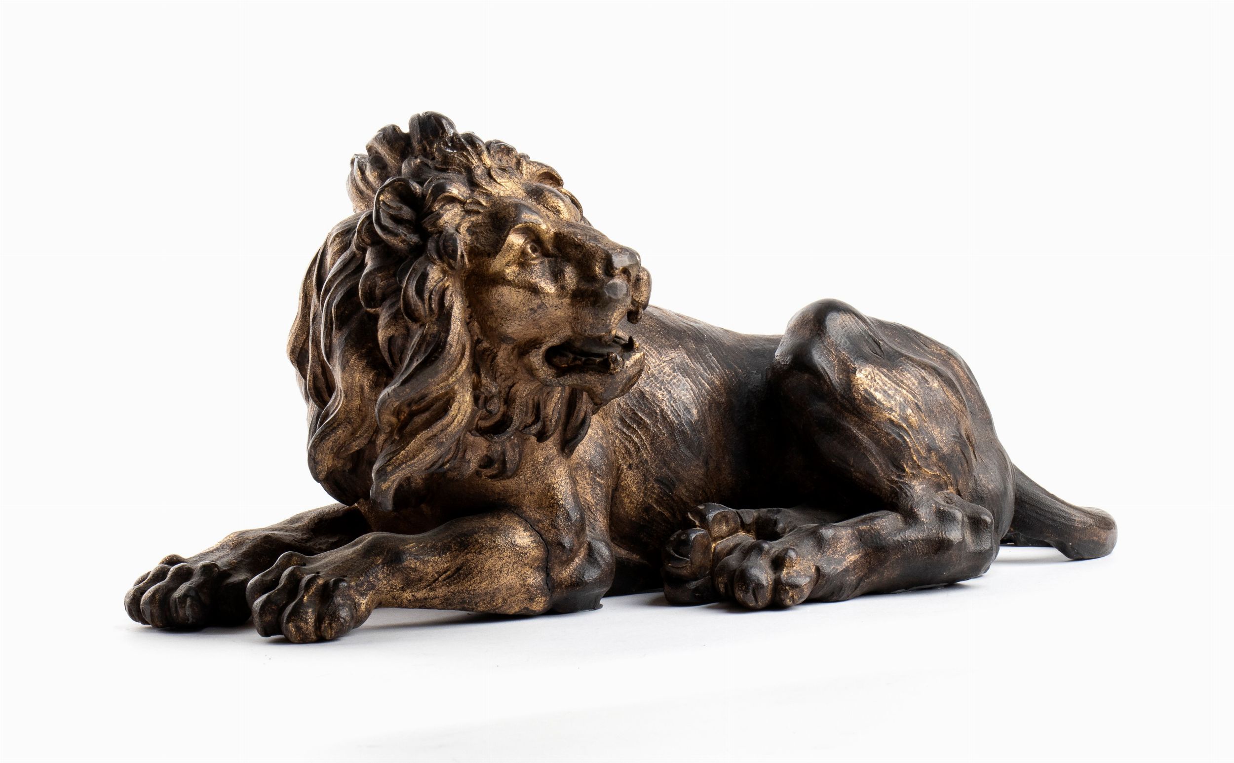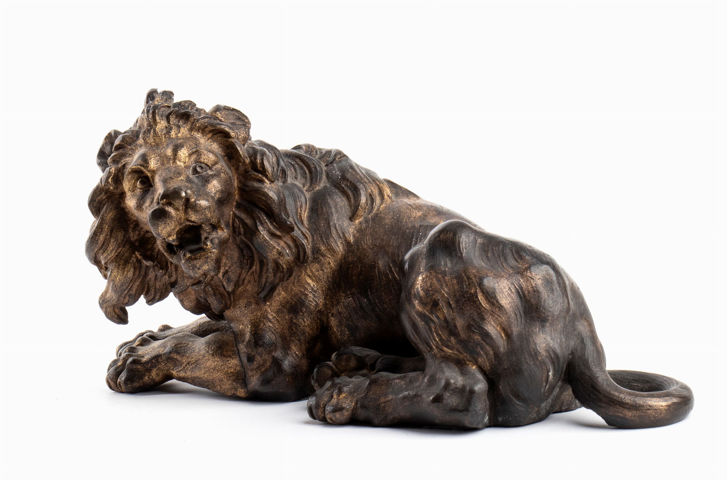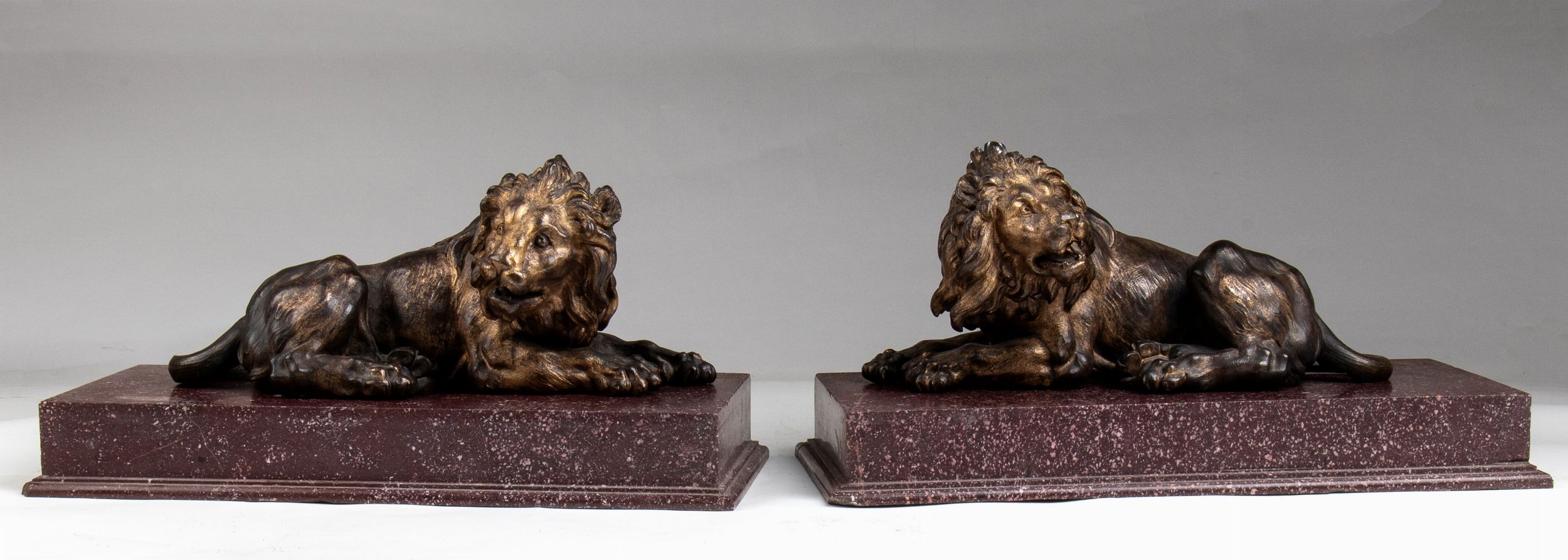 Bellissima coppia di leoni in bronzo fuso e meticolosamente cesellato nei particolari dei velli, e delle criniere. Queste vengono rese molto realisticamente grazie alla meticolosa lavorazione a freddo mediante cesello e punzonatura.