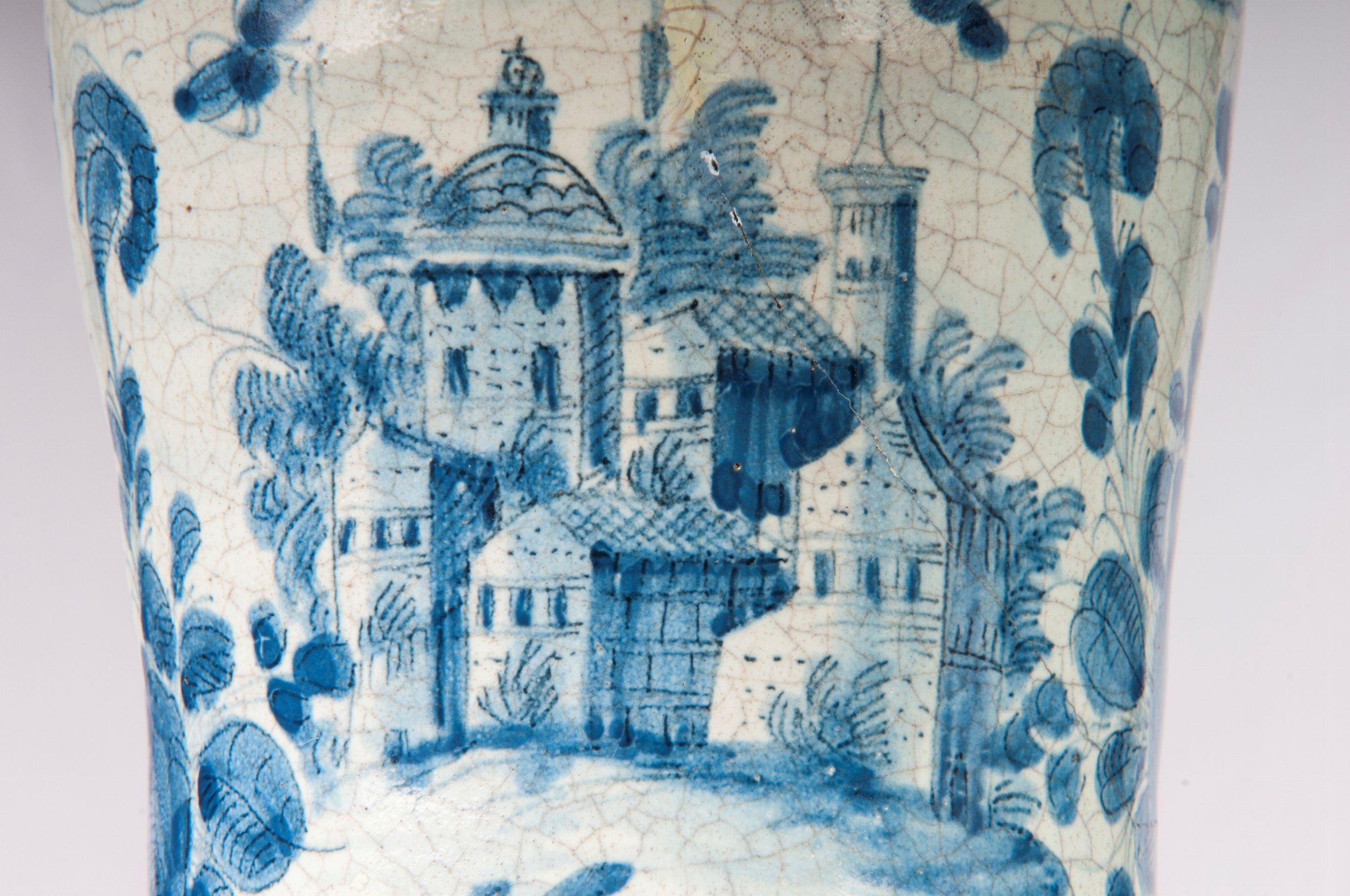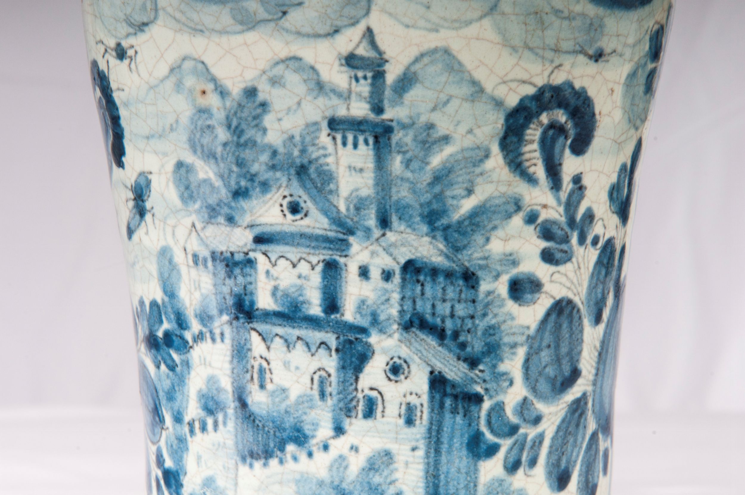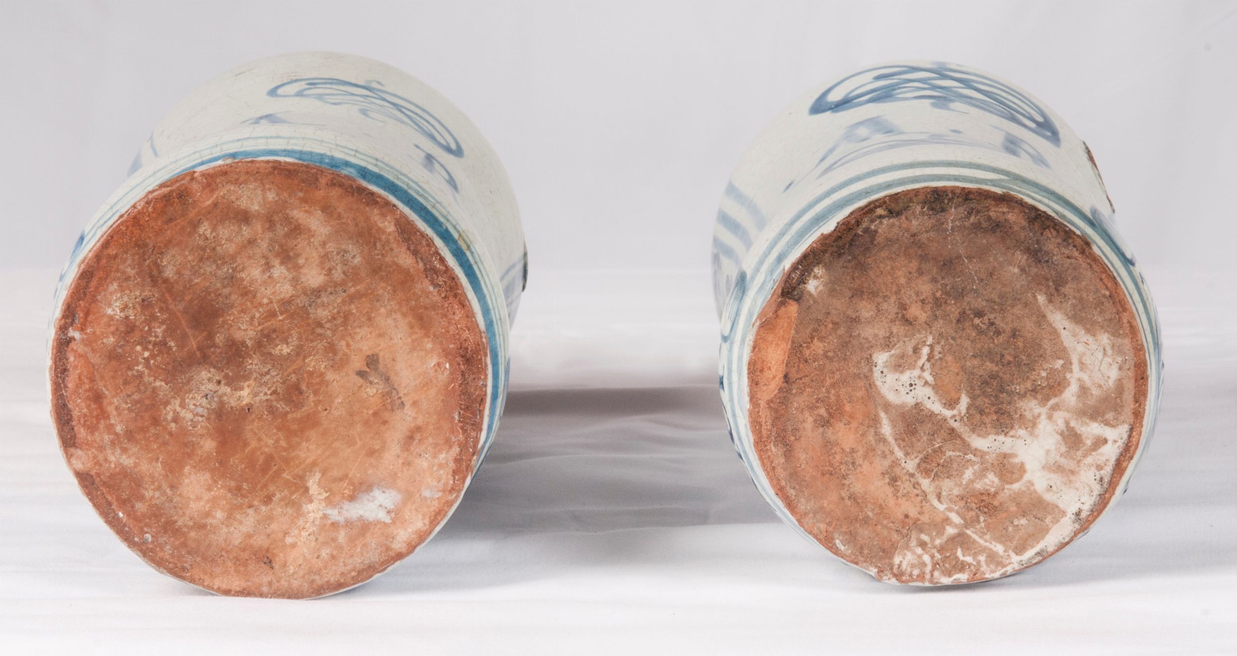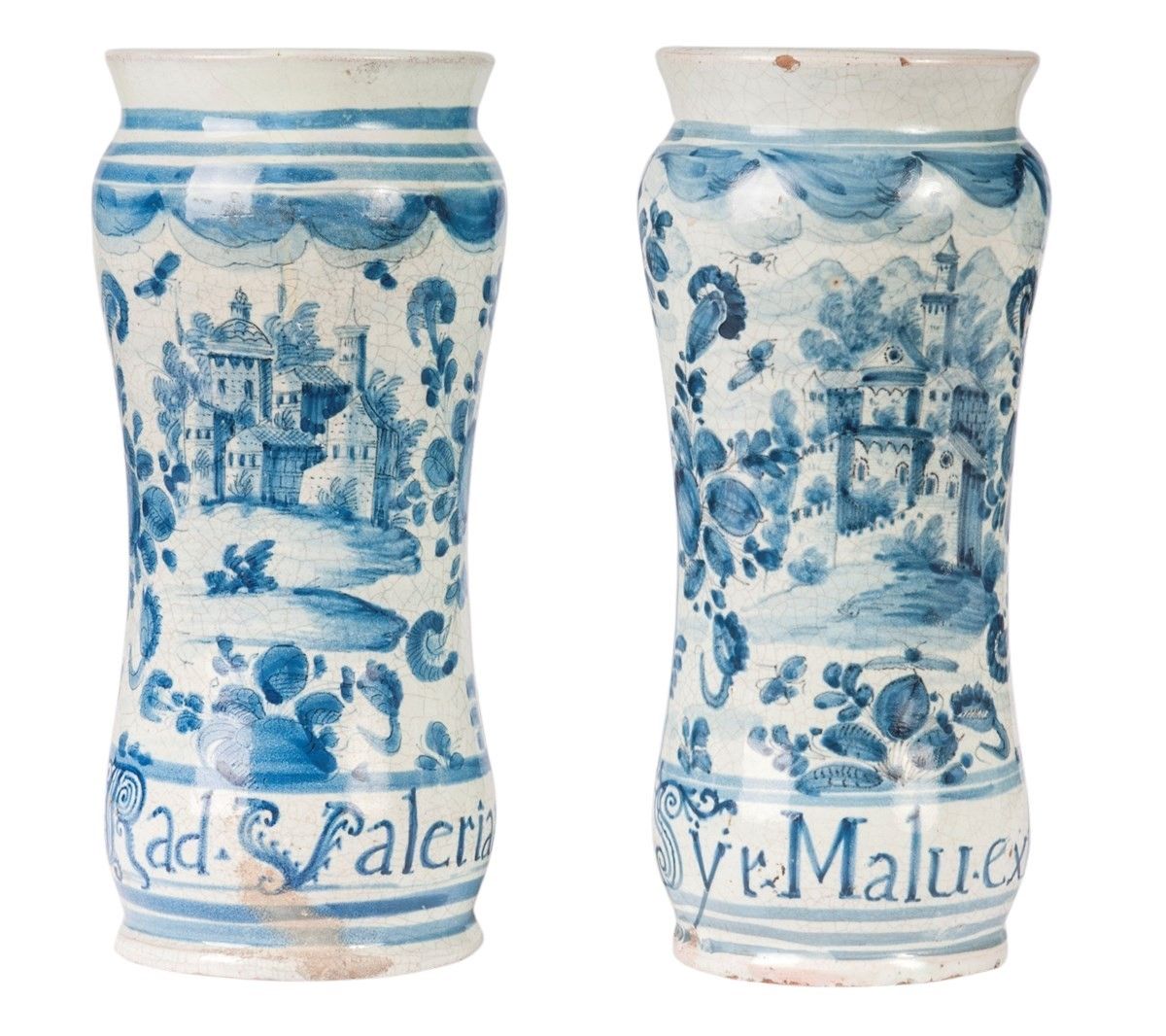 NAPOLI, FINE XVII SECOLO Ceramica, 24 x 10 x 9 cm ; 23,5 x 10 x 9,5 cm. Corpo leggermente rastremato al centro con spalla e base arrotondata. Orlo superiore estroflesso, base a disco tagliata alla stecca. Foggiatura al tornio. Decoro bianco e blu con scena di paesaggio entro riserva. Alla base anteriormente entro cartiglio iscrizione farmaceutica. Al retro iniziali con datazione. Stato di conservazione: buono con minime mancanze allo smalto dovute alla cottura.