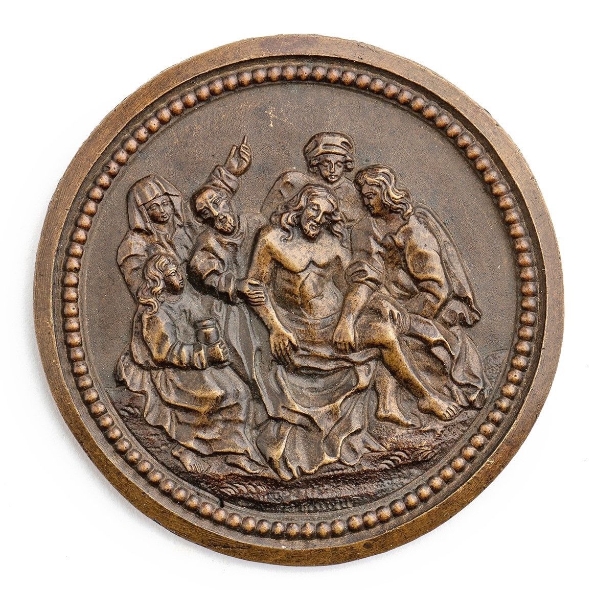 Scuola francese XIX secolo Placchetta tonda in bronzo con patina marrone chiara ; mm 50,8.