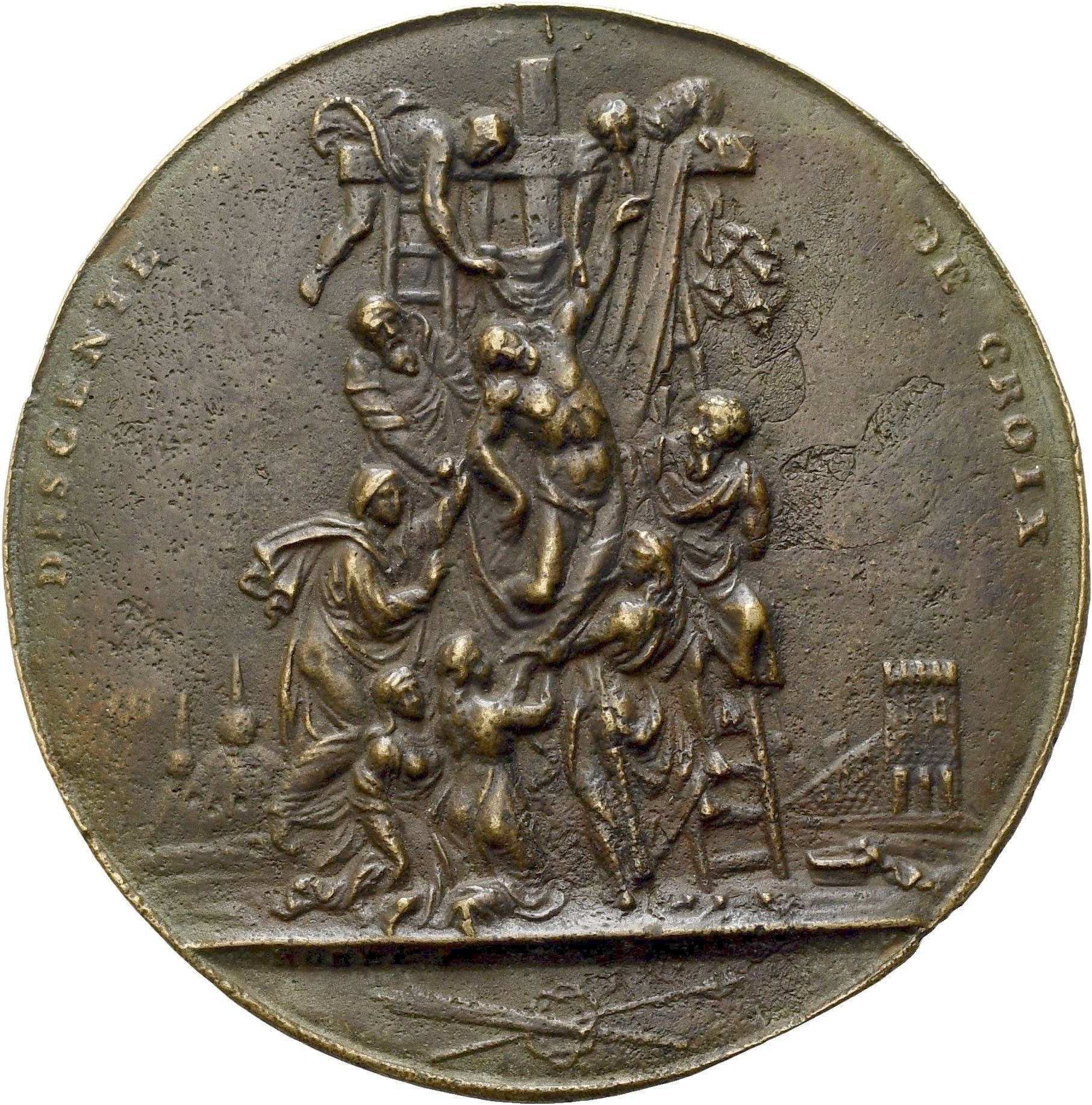 Scuola francese XIX secolo Ae fuso circolare; mm 73,1; patina giallognola. Scena della deposizione ripresa da una placchetta (tipo) di Pietro delle Campane Padova sec. XV. DESCENTE DE CROIX Due uomini calano il Cristo dalla croce. A sinistra si riconoscono Maria Maddalena e Maria Vergine, assieme ad un'altra pia donna; a destra, figura maschile (Nicodemo); in alto a sinistra, altra figura maschile. Sullo sfondo una cupola ed una torre. In esergo simboli della passione.
