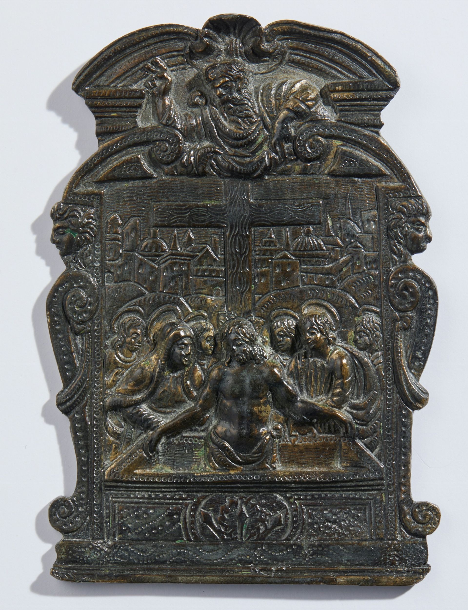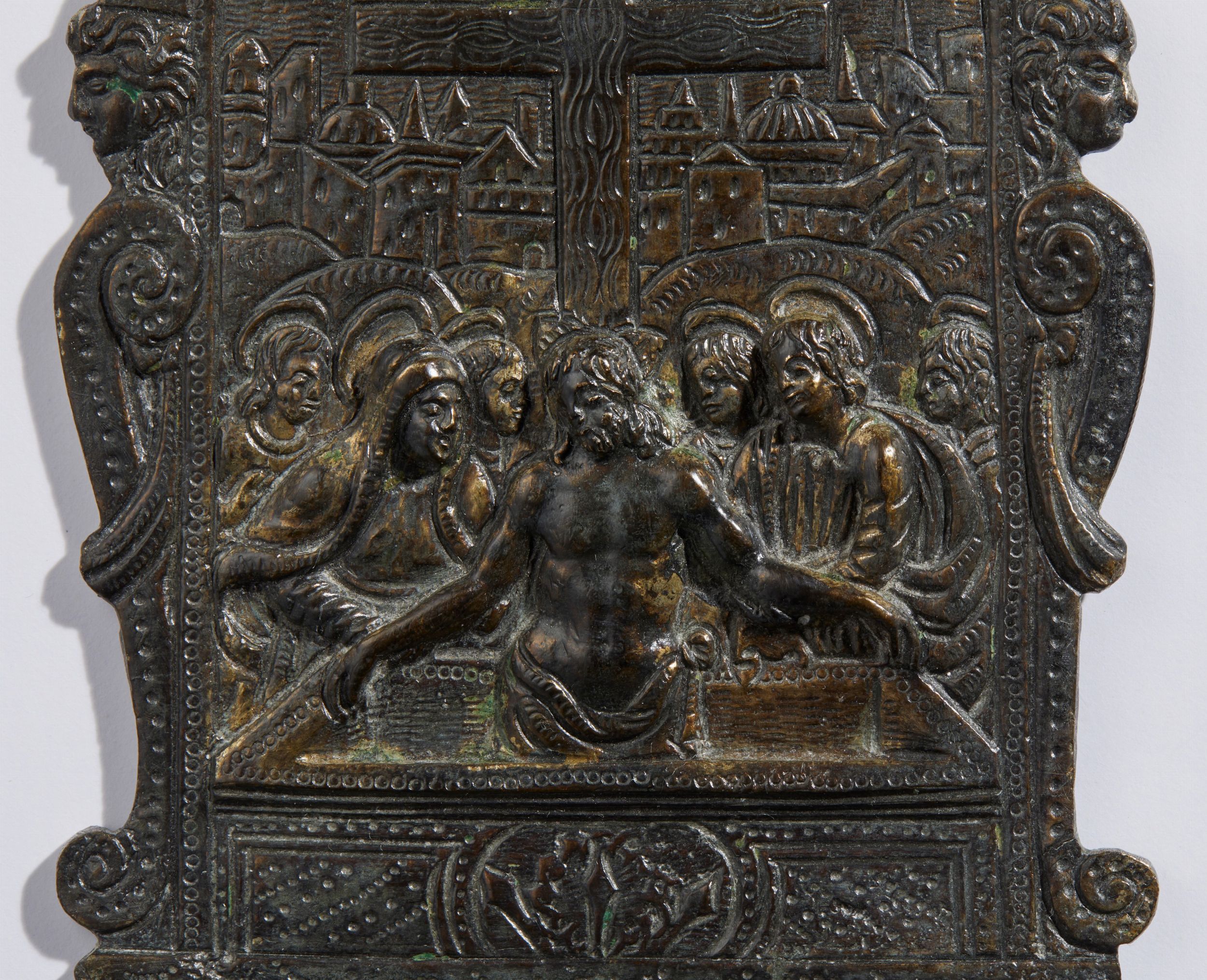 Lombardia, fine XVI secolo Placchetta in bronzo montata a Pace; mm 163 x 113. M utila della maniglia posteriore. Dettagli cesellati a freddo. La 'Pace' era una immagine sacra in bronzo munita di una presa posteriore per essere offerta dal celebrante al bacio del devoto.