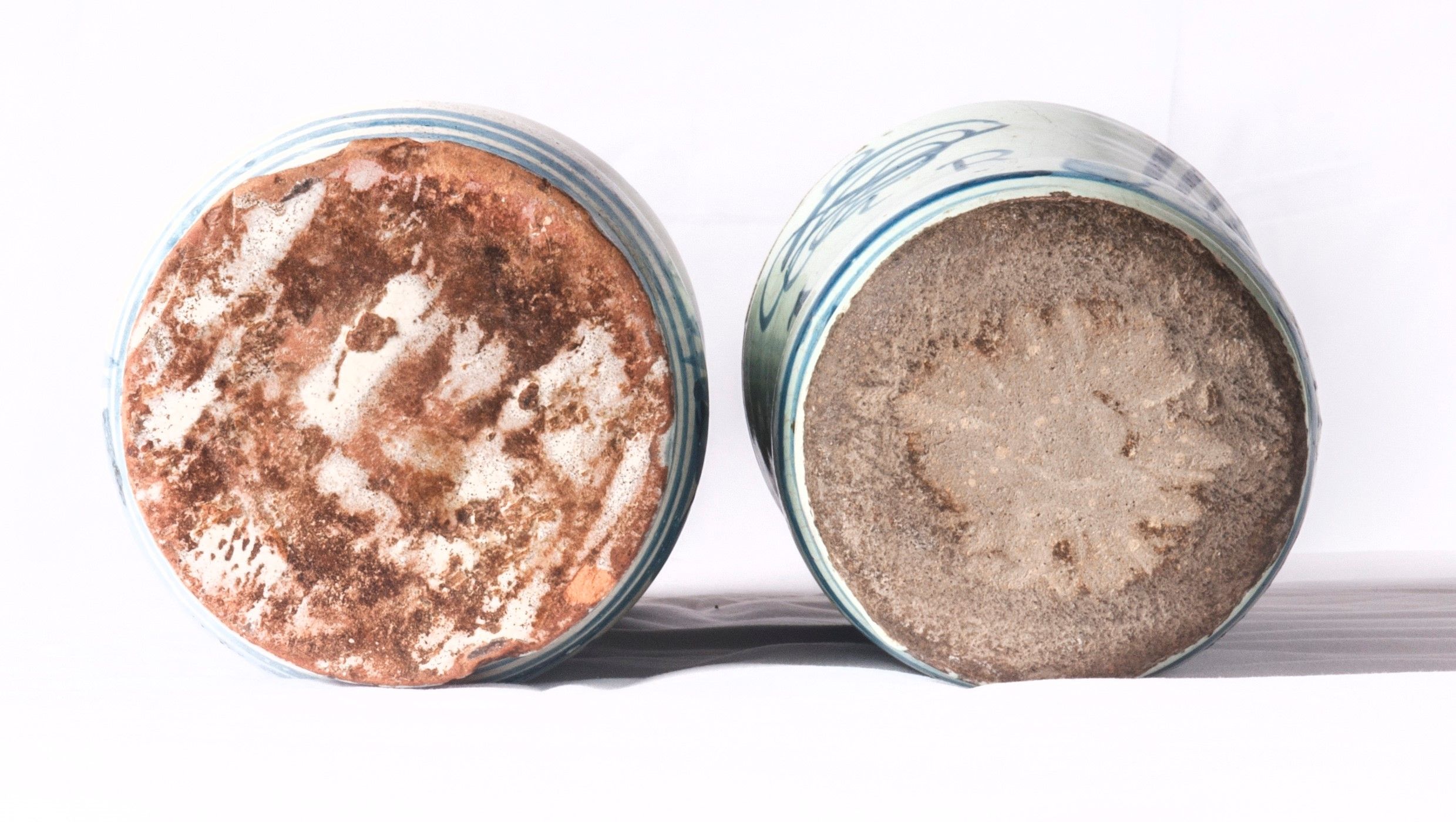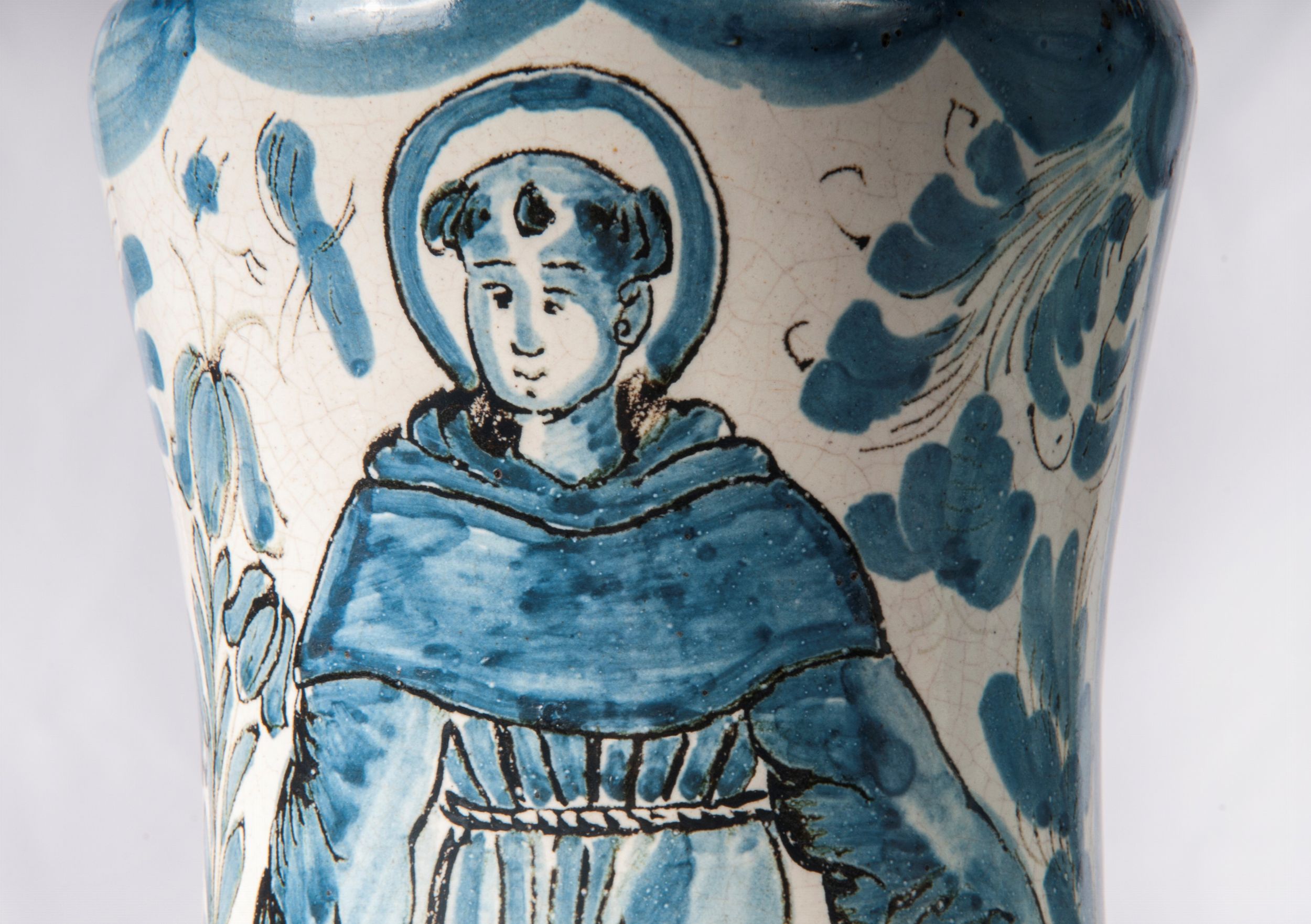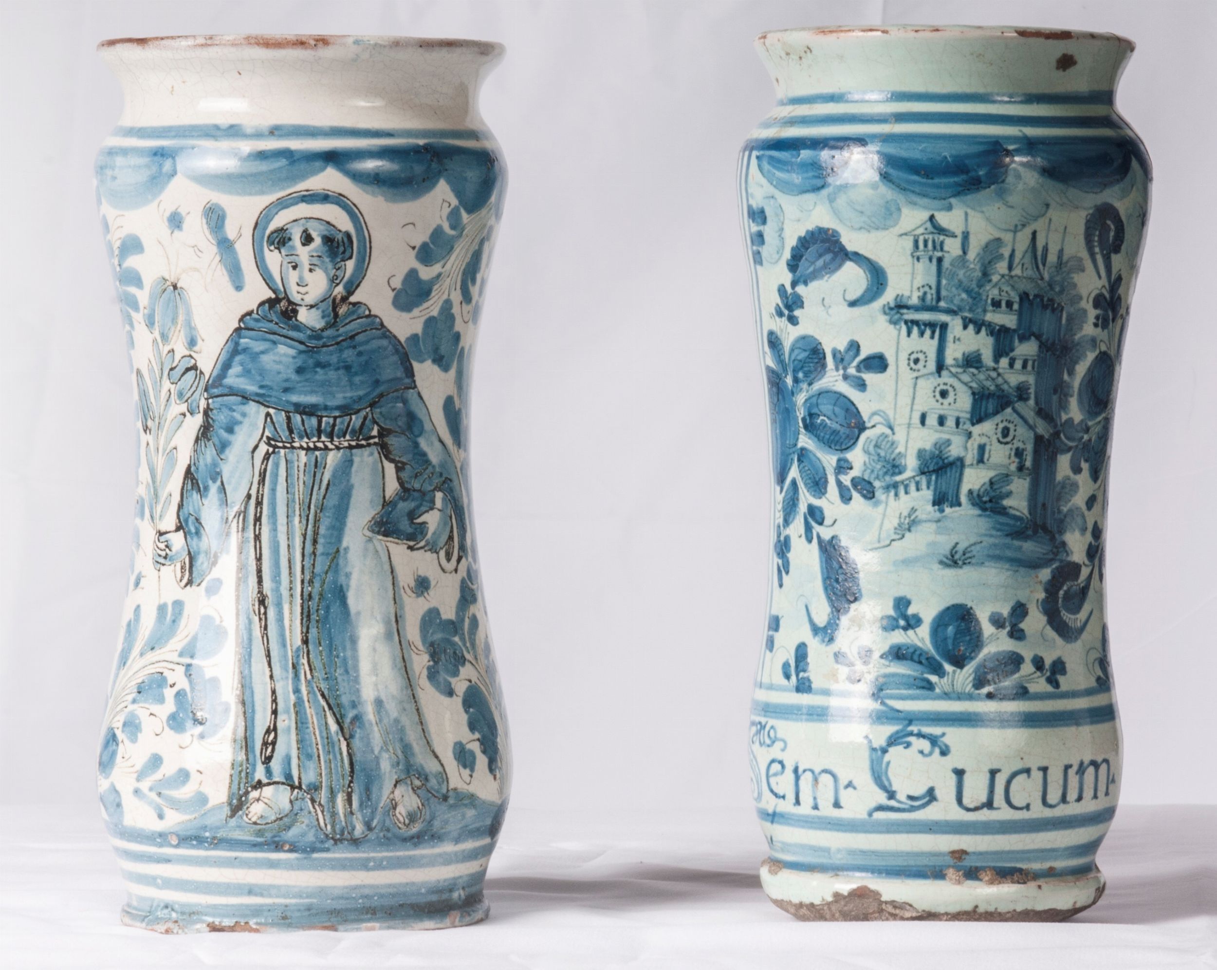Officine campane FINE XVII - INIZIO XVIII SECOLO Albarelli in ceramica; 25,5 x 10,5 x 9,5 cm; 25 x 11,5 x 10 cm. Corpo leggermente rastremato al centro con spalla e base arrotondata. Orlo superiore estroflesso, base a disco tagliato alla stecca. Foggiatura al tornio. Un albarello presenta decoro bianco e blu con scena di paesaggio ed architetture entro riserva. Alla base anteriormente cartiglio con iscrizione farmaceutica. Al retro iniziali con datazione. L'altro vaso presenta decoro bianco e blu con figura di S. Antonio entro riserva. Stato di conservazione: il primo con paesaggio presenta rotture e restauri al margine superiore; l'altro con santo ha minime mancanze all'orlo del piede.