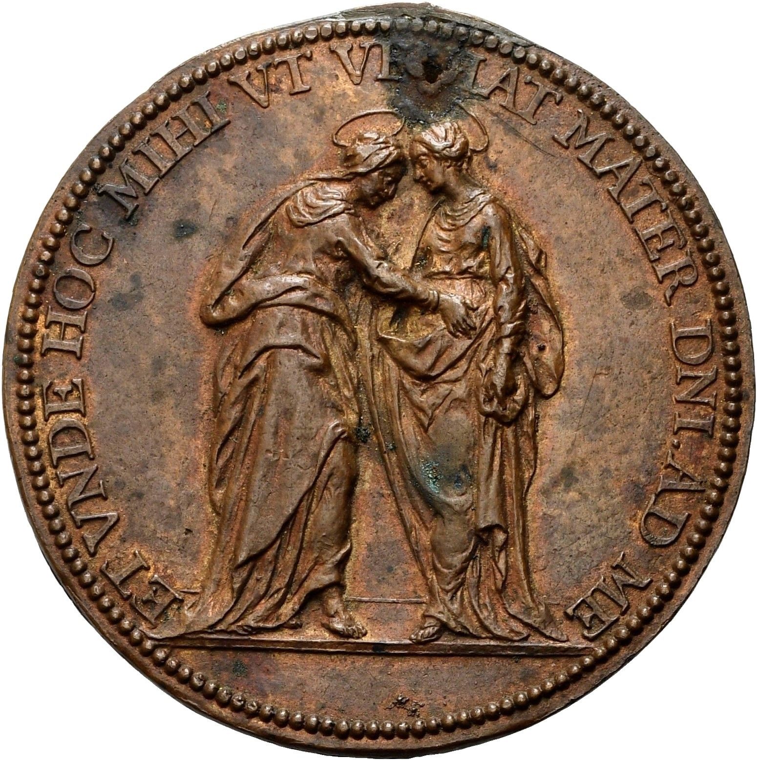 Medaglia in bronzo; mm 52,5. Tracce di appicagnolo divelto e piccolo foro in alto. D\ ET VNDE HOC MIHI VT VELAT MATER DNI AD ME La Vergine Maria e la Maddalena stanti. R\ FVUNDAMENTA EIVS IN MONTIBVS SANCTIS in esergo 16..2? Facciata del Duomo con cupole Rif. Non reperita nei testi consultati. Ex collezione Modesti