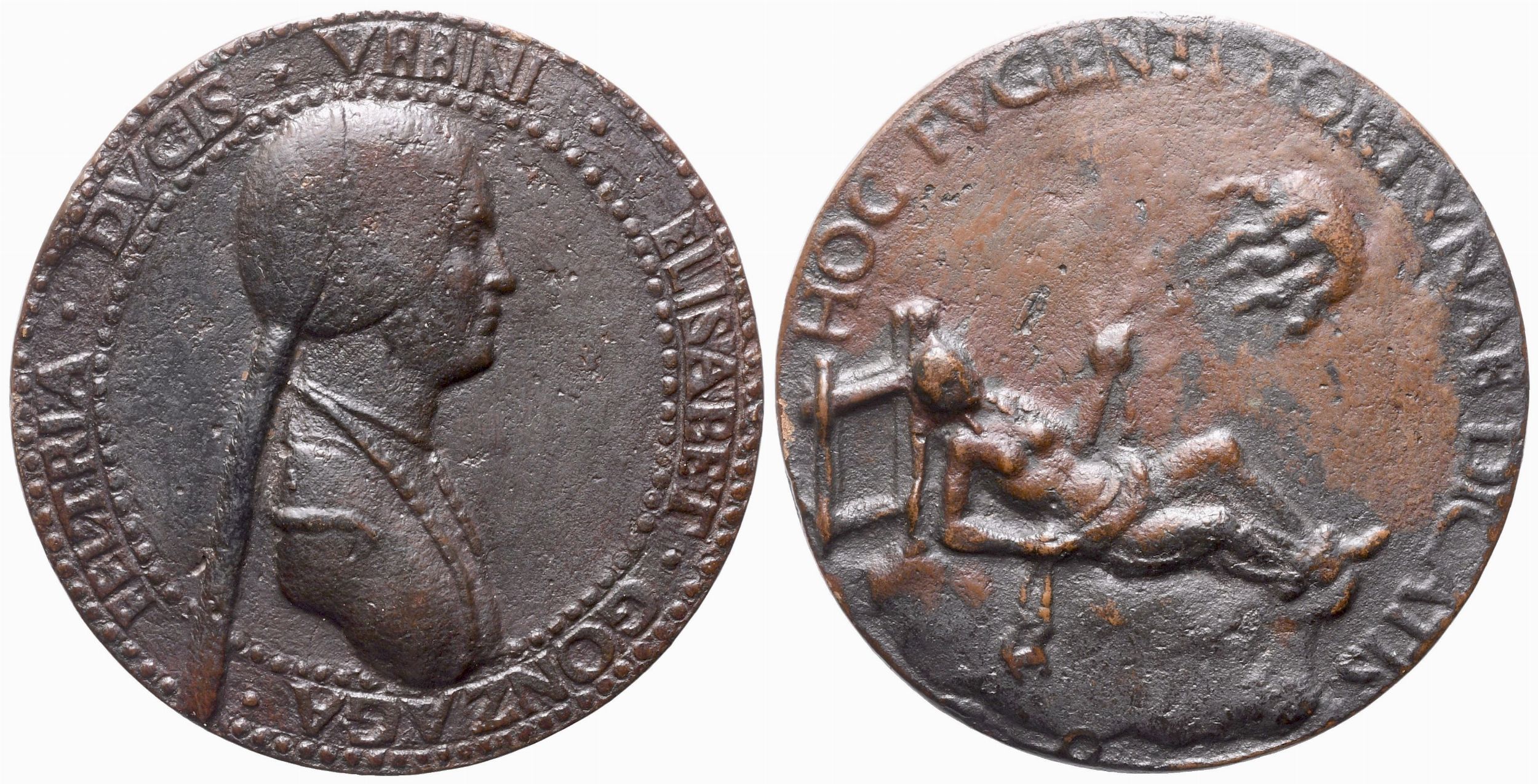Medaglia in bronzo con patina bruna; mm 78,8; gr 154. Fusione antica D/ ELISABET. GONZAGA FELTRIA DVCIS VRBINI Volto rivolto a destra R/ HOC FUGIENTI FORVNAE DICATIS Figura femminile nuda distesa su un letto, con la testa appoggiata alla testiera e le redini strette tra le mani. In alto, una nube da cui scaturiscono fiammelle. Rif . Hill 344