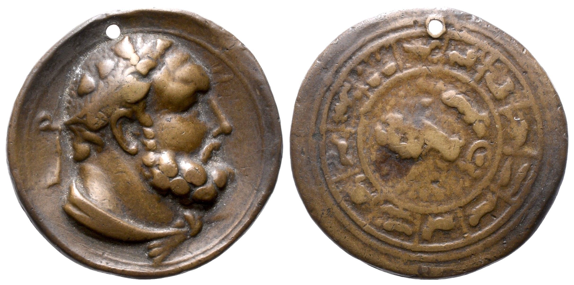 Medaglia in bronzo; mm 36,4; gr 23. Fusione antica D/ Busto di Ercole con testa cinta da ghirlanda e foro di sospensione. R/ Segni dello zodiaco