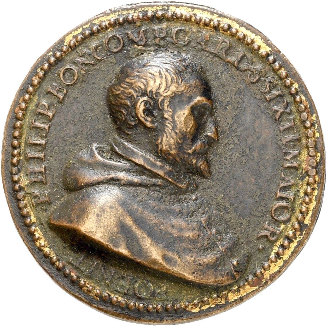 1582 Medaglia in bronzo con tracce di doratura; mm 46,3. Fusione antica. D\ PHILIP BONCOMP CARD S SIXTI MAIOR POENIT Busto di Federico Boncompagni verso destra con mozzetta R\ RESTAVRAV – IT – AN – SAL MDLXXXII Facciata della chiesa di San Sisto, in esergo ROMAE Rif. Ex Ars Classica 118, n.102. Ex collezione Modesti