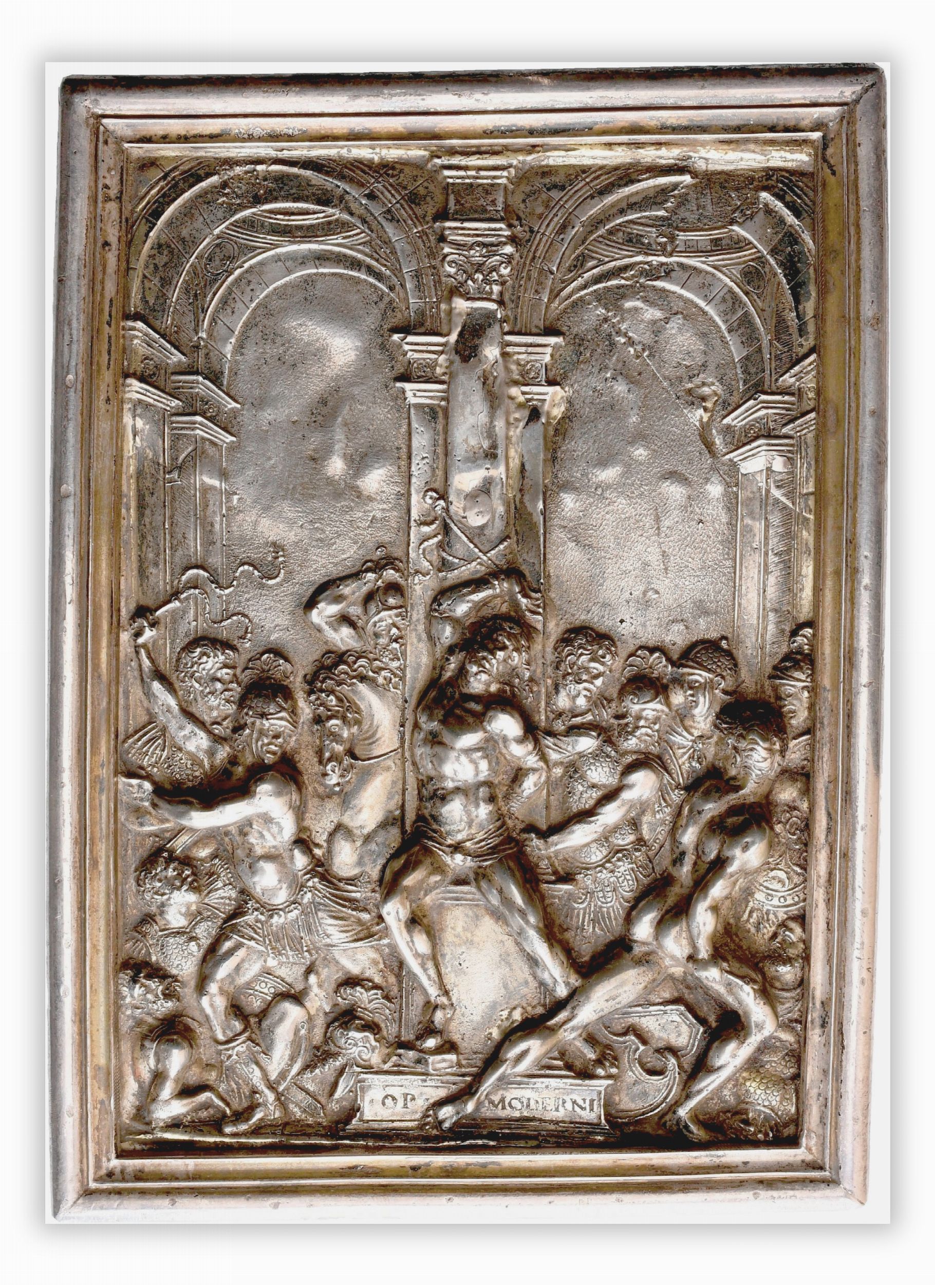 Va detto che il nostro raffinato altorilievo in argento si presenta come una replica di una placchetta, in argento parzialmente dorato, conservata al Kunsthistorisches Museum di Vienna, di cui riprende non solo le dimensioni (13,7 x 10,3 cm), ma anche la resa dei dettagli decorativi. Tale placchetta e il suo pendant, raffigurante una Madonna con Bambino e Santi , sono unanimemente considerate il capolavoro del Moderno e dal 1954 identificate con i due rilievi commissionati al Moderno dalla famiglia Grimani di Venezia descritti a più riprese da fonti antiche. La scoperta della nostra placchetta, gli studi e le analisi scientifiche su di essa condotti a partire dal 2019 portano però a ritenere che il Moderno avesse tratto dallo stesso modello originale due coppie di placchette autografe, quella conservata a Vienna e quella di cui la nostra Flagellazione rappresenta l’esemplare superstite, essendo andato smarrito il pendant con la Madonna col Bambino.