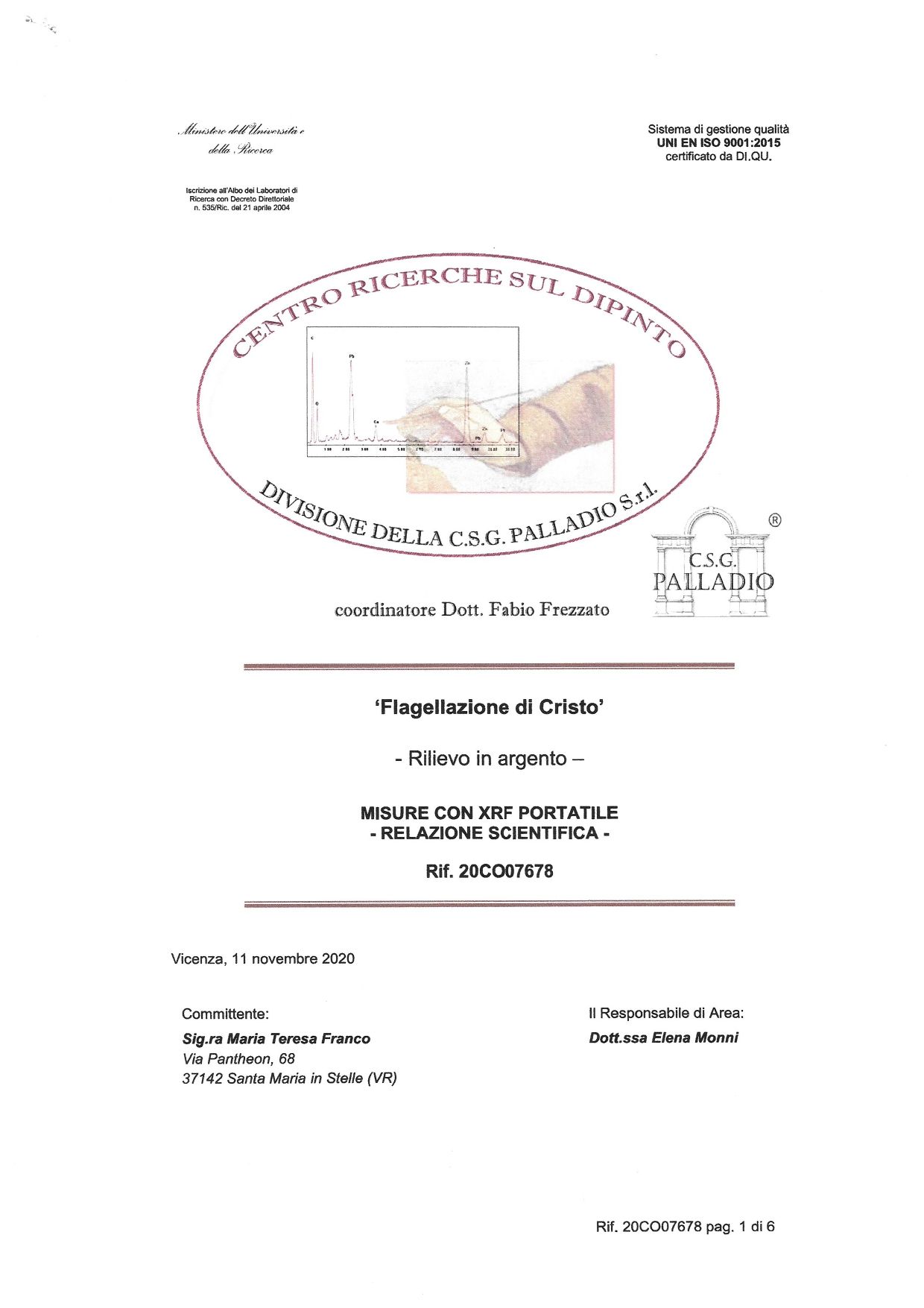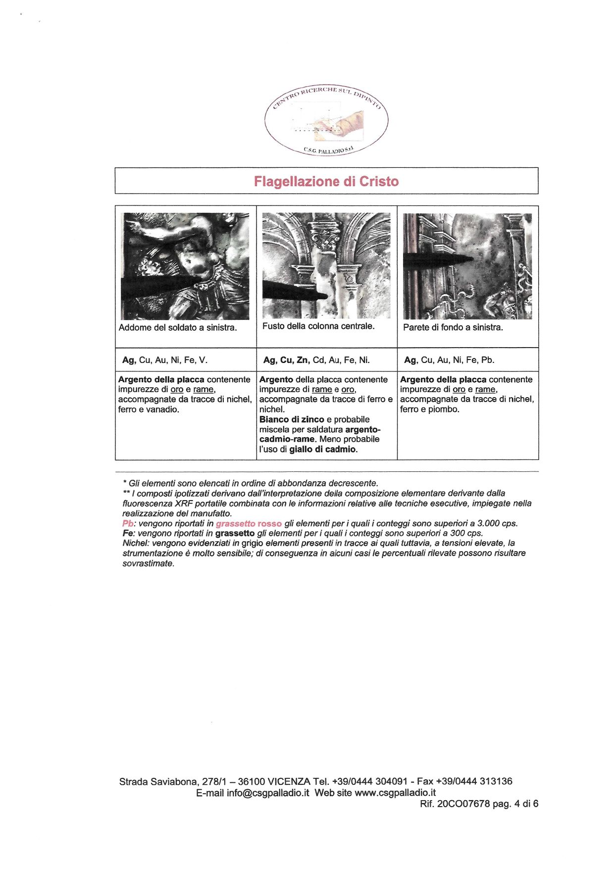 Infatti, se da un lato le indagini eseguite attraverso misure di fluorescenza X (XRF), presso il Centro Ricerche sul Dipinto Divisione della C.S.G. Palladio S.r.l (coordinatore dottor Fabio Frezzato), hanno permesso “di ricondurre la composizione della placca – argento contenente impurezze di rame e di oro – a una manifattura antica e compatibile con il dato stilistico”, nel contempo sempre le misure di fluorescenza X(XRF), proprio in corrispondenza del fusto della colonna centrale, in cui sono presenti i grossolani tasselli, hanno fatto registrare significativi ratei di conteggio di zinco e cadmio, e, inoltre, nella stessa zona, il rame è risultato presente in percentuale significativamente più elevata rispetto alle altre zone indagate. Secondo Fabio Frezzato, è del tutto verosimile che per la riparazione dei punti danneggiati si sia ricorso ad un amalgama, in uso tra il 1850 e gli anni Settanta del Novecento contenente rame e cadmio.