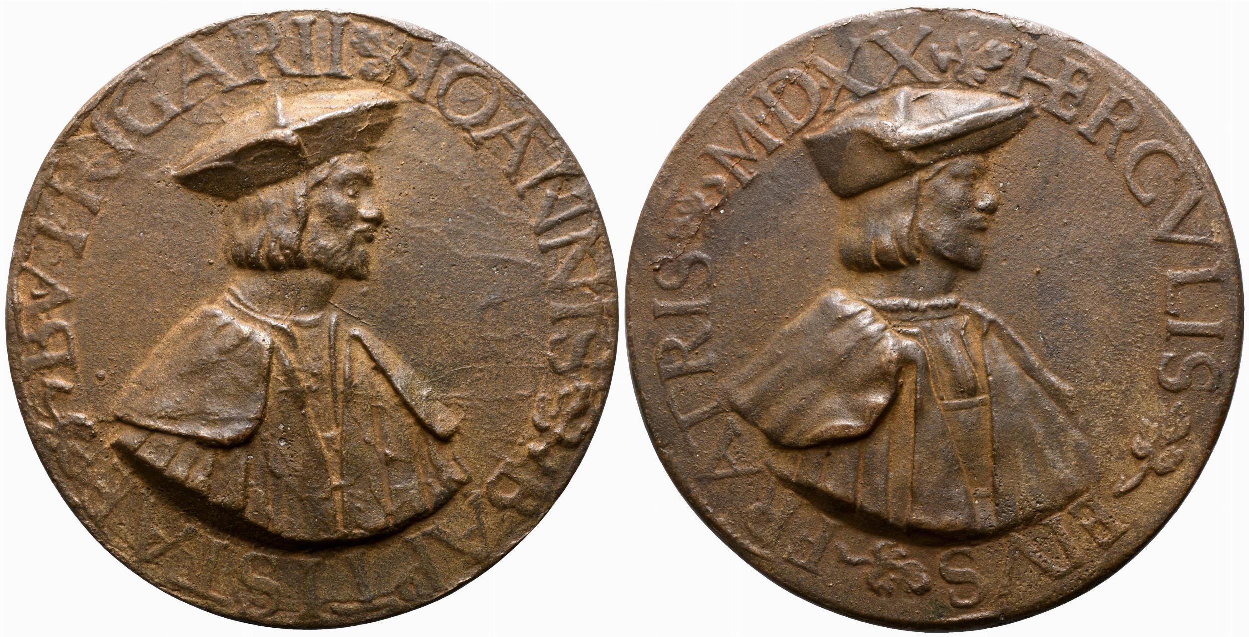 Medaglia in bronzo; mm 80,8; gr 242. Fusione antica D/ IOANNIS BAPTISTAE BVTIGARI Busto con barba rivolto a destra R/ HERCVLIS EIVS MDXX Presente secondo busto con barba rivolto a destra. Rif. Hill 620