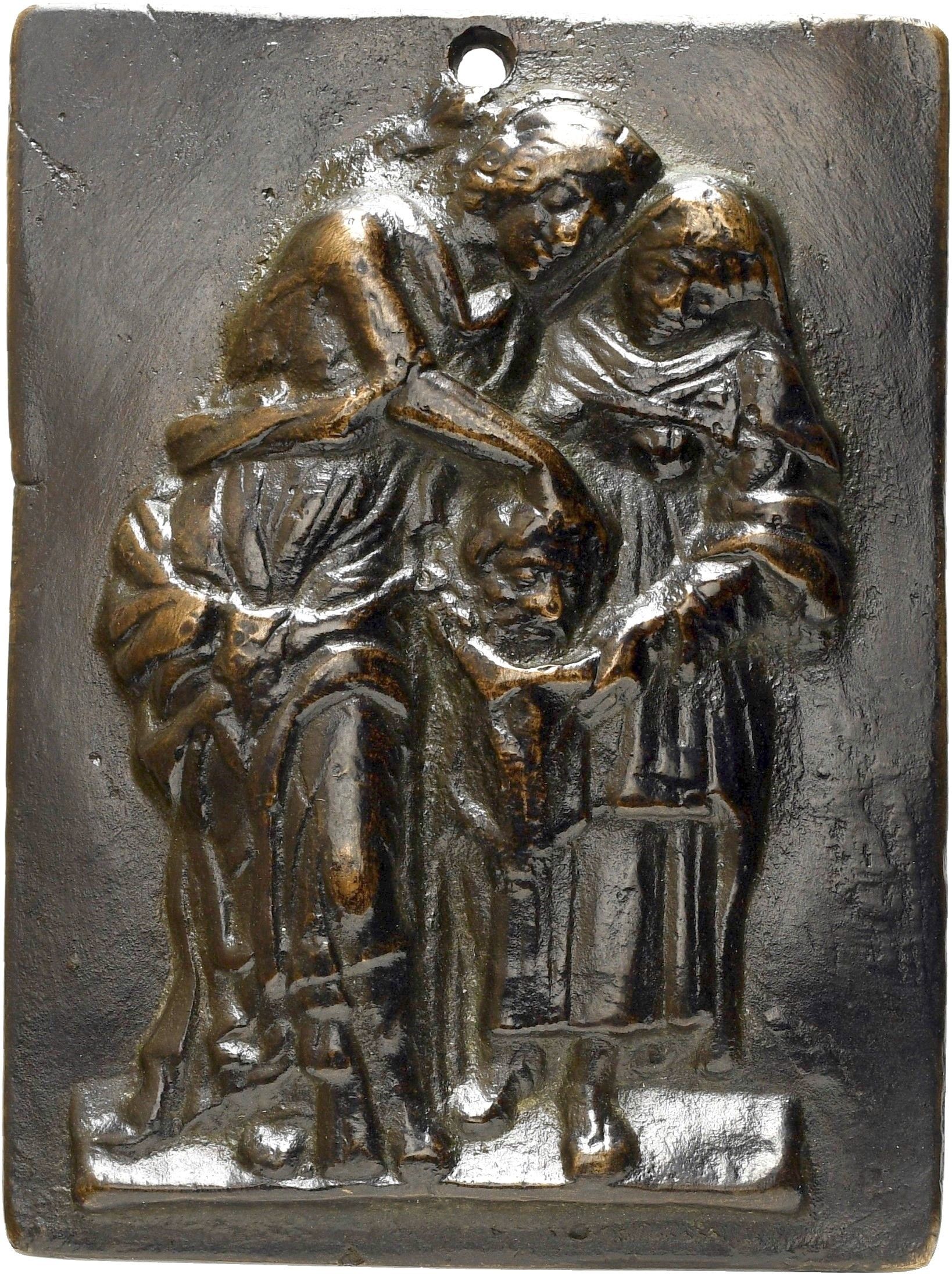 Placchetta in bronzo rettangolare, patina marrone scuro; mm 97,3 x 71,6; gr 237,6. Giuditta in piedi e con la testa inclinata, nell'atto di infilare la testa di Oloferne dentro ad un sacco sorretto da una donna. Le due figure poggiano i piedi su di una piattaforma. Fondo liscio. Foro in alto. Splendida fusione antica. R\ vecchio adesivo di antica raccolta. Bibl. Rossi F. coll Scaglia, 2011 VII.10 var. C; Toderi –Vannel, 1996 n.198