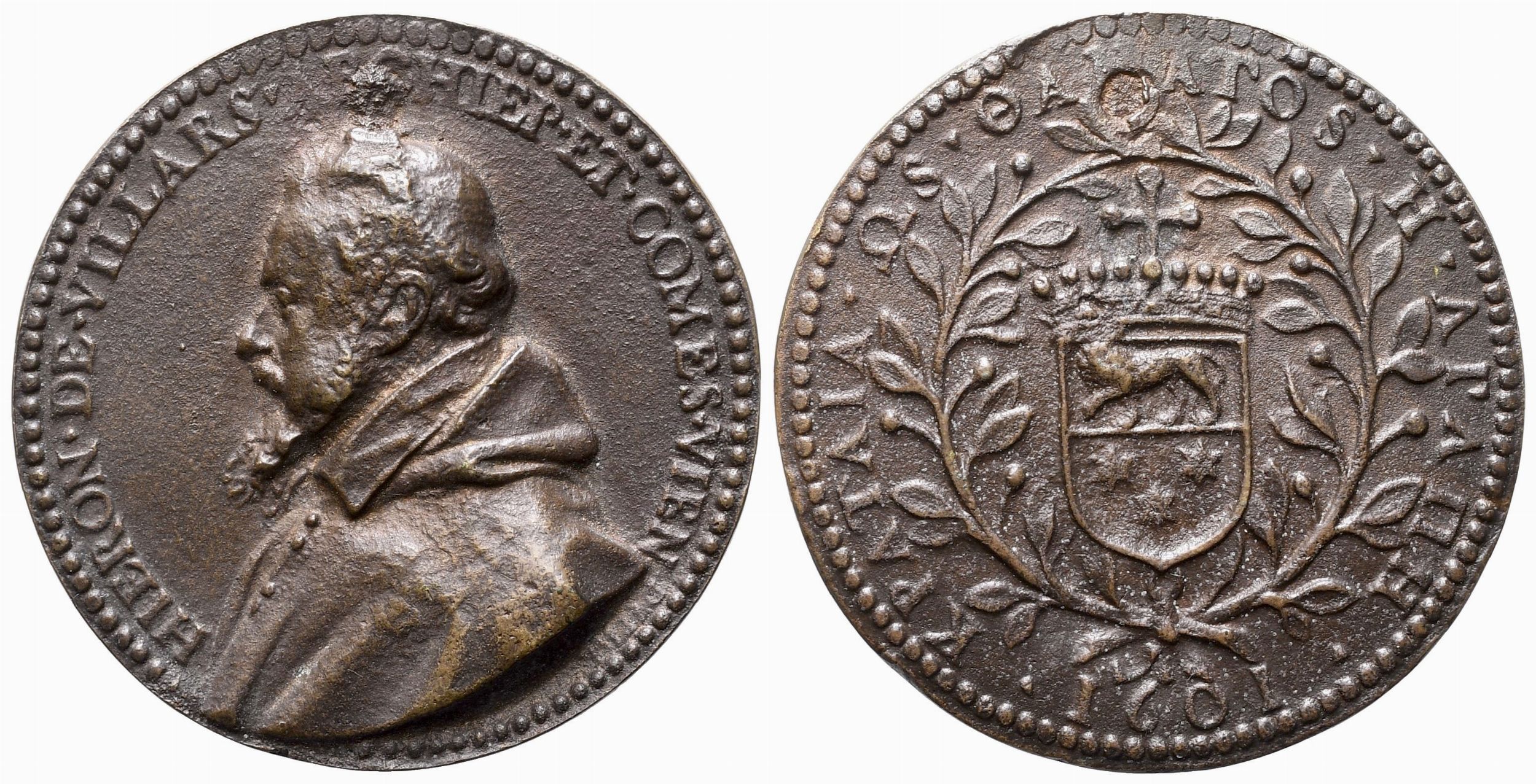 Medaglia in bronzo; mm 52,2; gr 46. D/ HIERON DE VILLARS AR CHIEP ET COMES VIEN figura maschile rivolta verso sinistra R/ stemma con scritte