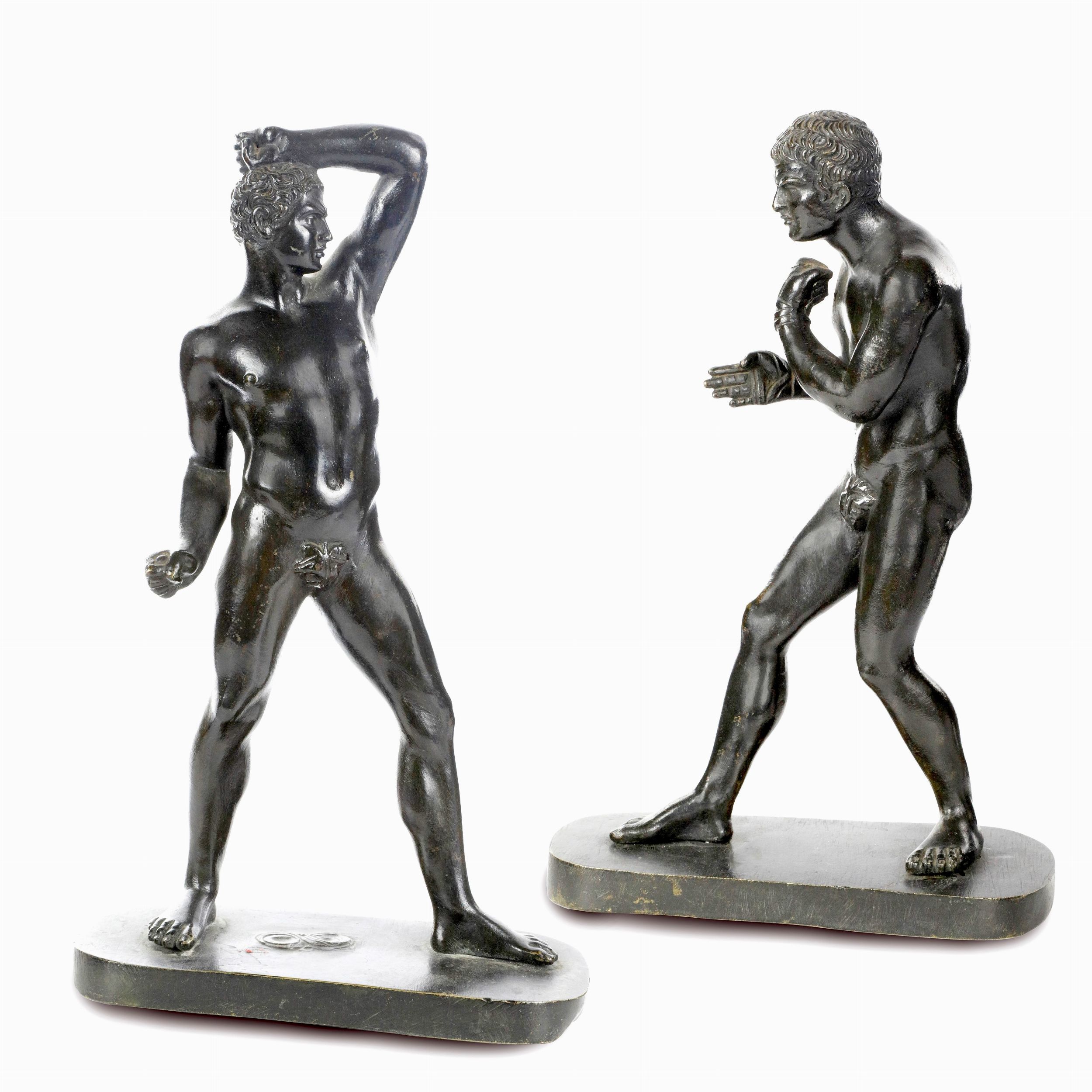 XIX secolo Questa coppia di bronzetti è tratta dalle famose sculture realizzate dal Canova ora in Vaticano, nel cortile del Belvedere, Museo Pio Clementino. I due pugilatori raffigurano Creugante e Damosseno, due atleti che combatterono nei Giochi Nenei e, rimasti in parità , si affrontarono sferrandosi un unico colpo. Il secondo, con inganno, affondò la mano tesa nel fianco dell'avversario uccidendolo. Pio VII acquistò il primo dal Canova per reintegrare parte delle espoliazioni napoleoniche, e commissionò il secondo allo scultore per completare la coppia. I gessi sono ora nella gipsoteca di Possagno, ma alcune copie furono realizzate e mandate in Europa per far conoscere il soggetti. I due bronzetti in esame sono copie rivisitate dei due pugilatori, mancano in effetti i tronchi che davano stabilità alle due sculture in marmo e presentano minime diversità nei particolari. Possiamo considerare fusioni ottocentesche di buon livello legate al gusto grand tour.