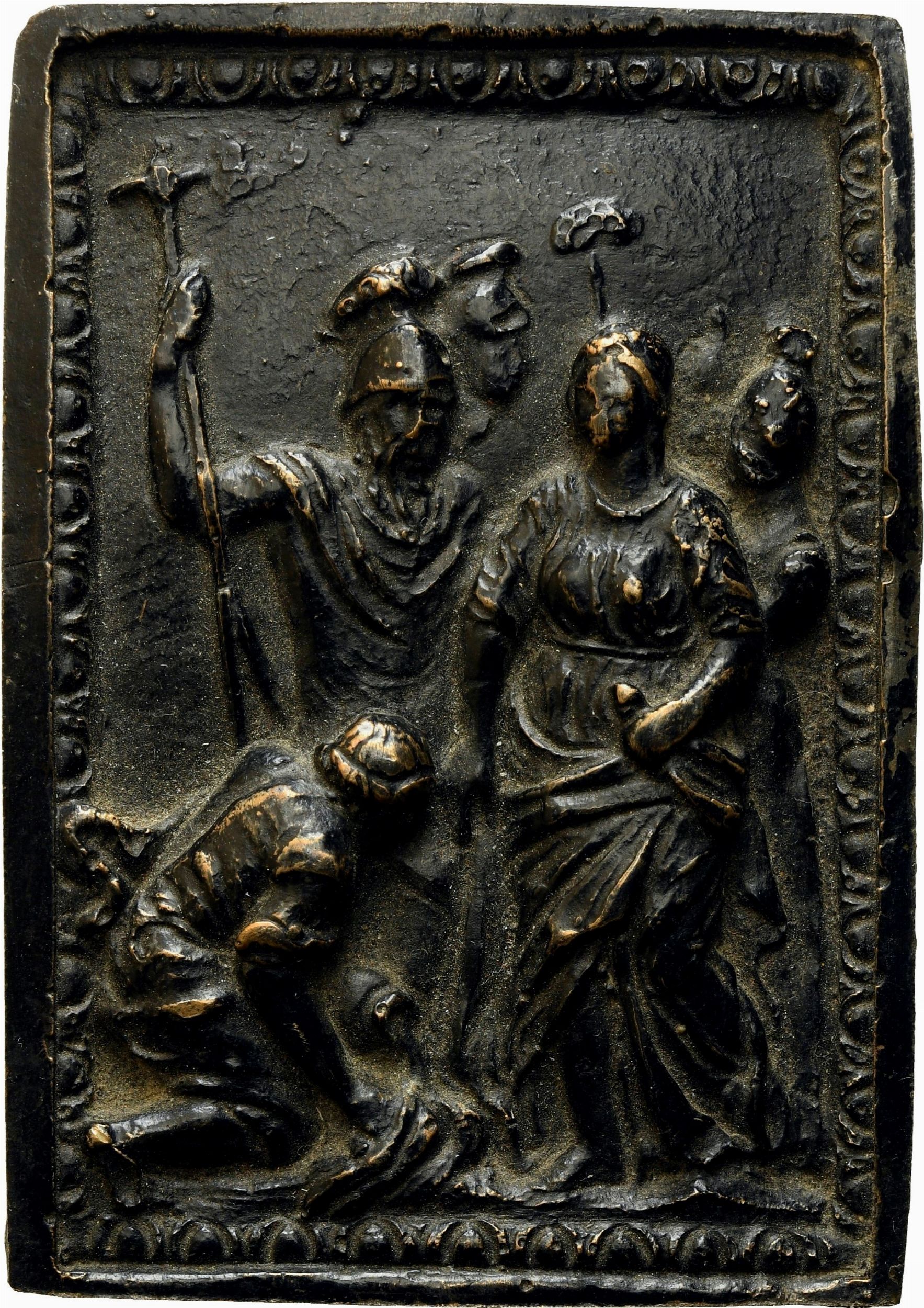 Officine romane XVIII secolo 1) Placchetta rettangolare in bronzo con patina marrone scuro; mm 78 x55; gr 119. Militare romano Augusto? indica a la strada a Sibilla che tiene tra le mani una pergamena; dietro altro soldato. Bordino rialzato a motivi vegetali. Bibl. Non reperita nei testi consultati. 2) Placchetta rettangolare in bronzo con patina marrone scuro; mm 78 x54; gr 113. Figura femminile in primo piano, un'altra figura chinata (allegoria del fiume TEVERE?) dietro di loro tre soldati romani. Bordino rialzato a motivi vegetali. Bibl. Non reperita nei testi consultati