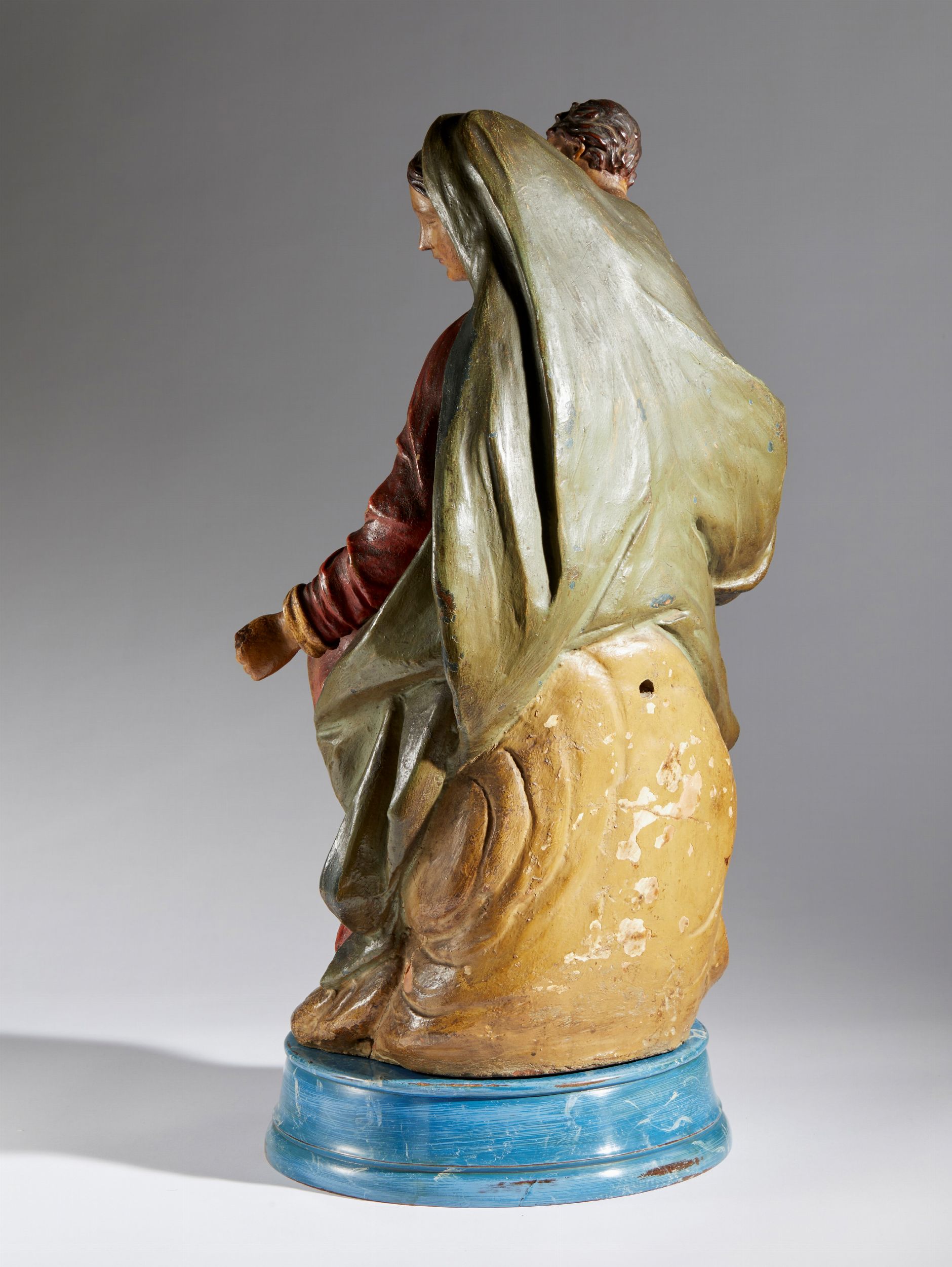 Artista bolognese, XVII-XVIII Terracotta policroma; 56x32x29 cm. Mancanza alla mano sinistra della Madonna Questa importante scultura raffigura la Madonna seduta sulle nuvole con il Bambino in braccio. La Madonna veste una semplice tunica di colore rosso molto intenso. Il Bimbo, nudo e in piedi, viene sorretto dalla madre con il braccio destro. Entrambe le figure, magistralmente modellate, mostrano espressioni assorte e lontane, con una vaga sfumatura di malinconia. Questa scultura in terracotta policroma, viste le dimensioni contenute ma importanti, potrebbe essere stata destinata a culto domestico. Si tratta quasi sicuramente di produzione bolognese legata alla grande cultura plastica di autori quali Giuseppe Maria Mazza ( Bologna, 1653-1741) o entourage. Bibl. AAVV, Presepi e Terracotte nei Musei Civici di Bologna, Nuova Alfa Editoriale, Cento (Ferrara), 1991.