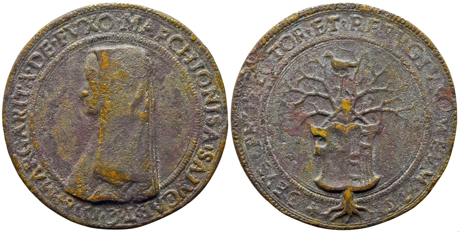 Medaglia in bronzo; mm 44,3. Antica fusione. D/ MARGARITA. DE. FVXO. MARCHIONISA. SALVCIAR. Busto a sinistra con capo coperto dal velo di vedovanza R/ DEVS PROTECTOR ET REFVGIVM MEVM stemma di Saluzzo e Foix, appeso ad un albero sradicato e sfrondato; in alto un uccellino.