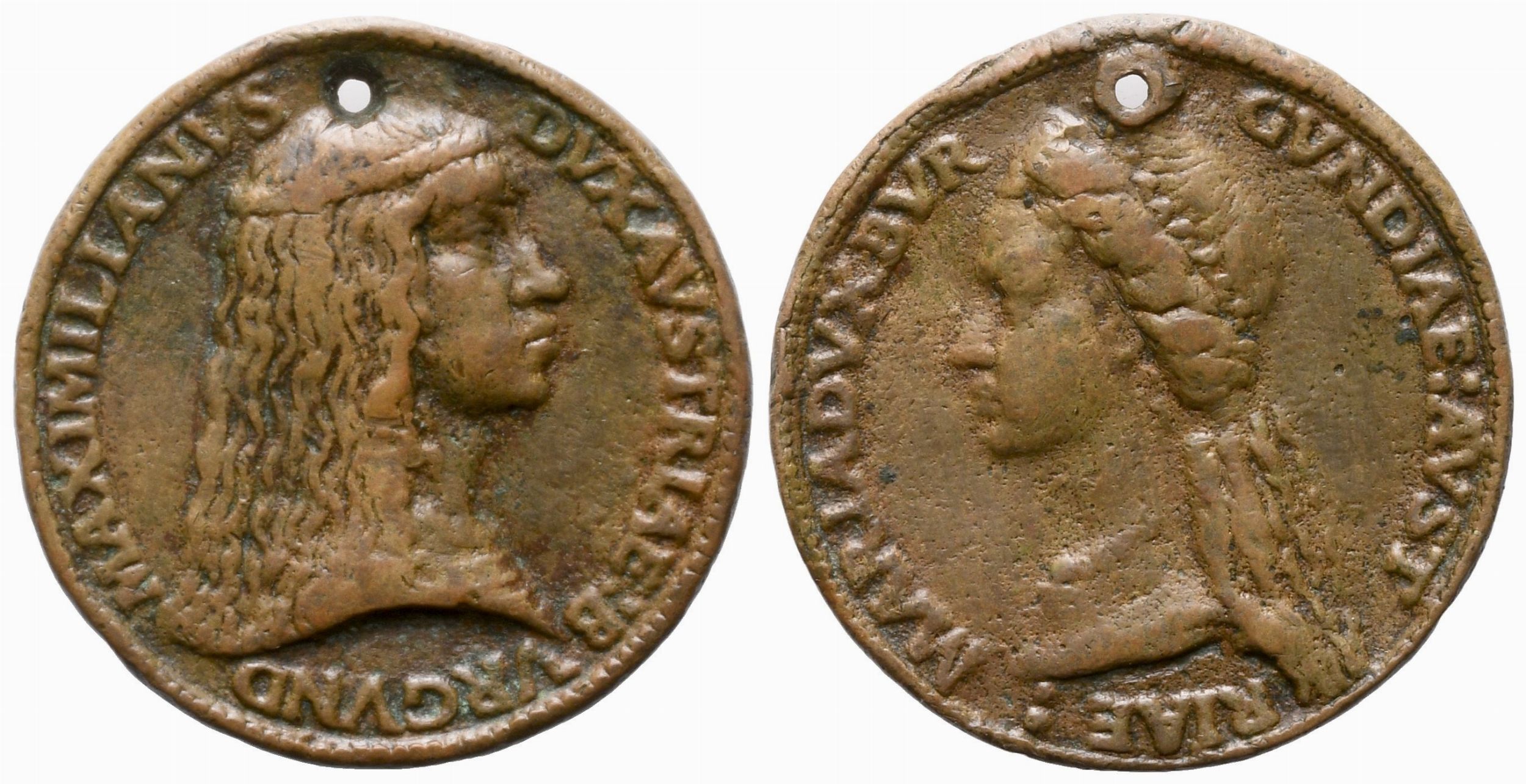 1477 Medaglia in bronzo, patina marrone chiaro; mm 42,5; gr 26. Fusione antica D/ MAXIMILLINVS DVX AVSTIAE B VRGVND Mezzo busto maschile rivolto a destra R/ MARIA DVX BVR GVNDIAE AVST RIAE Mezzo busto femminile rivolto a sinistra