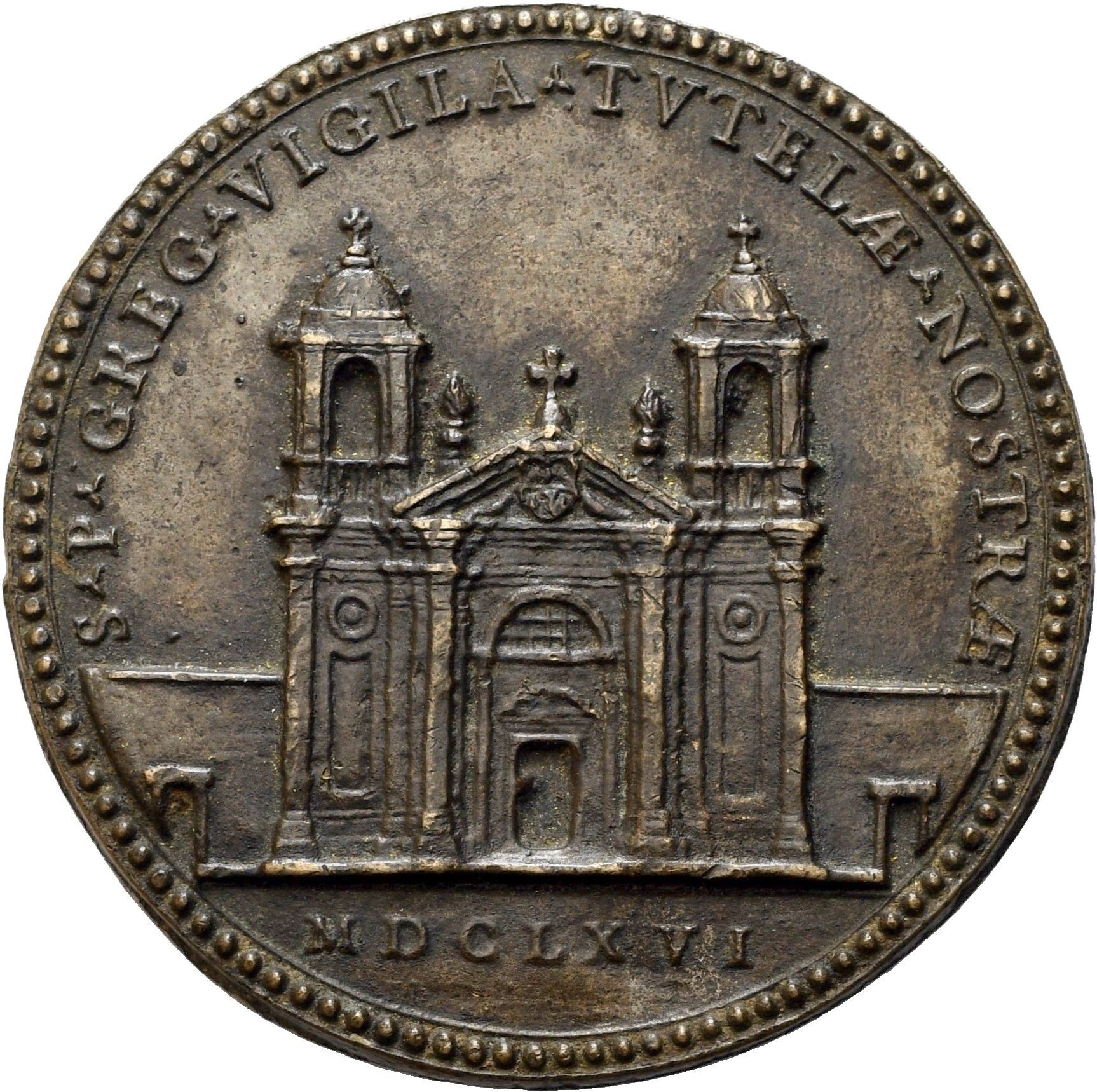 1666 Medaglia in bronzo; mm 58,5. Splendida fusione originale. Molto rara. D\ IOANNES . BAPTISTA . PRINC . BVRGHESIVS Stemma del Principe Giovanni Battista Borghese R\ S.P. GREG. VIGILA.TVTELAE. NOSTRAE in esergo MDCLXVI Facciata della nuova chiesa. Rif. Modesti, 2006 n.230 (questo esemplare). Ex collezione Modesti