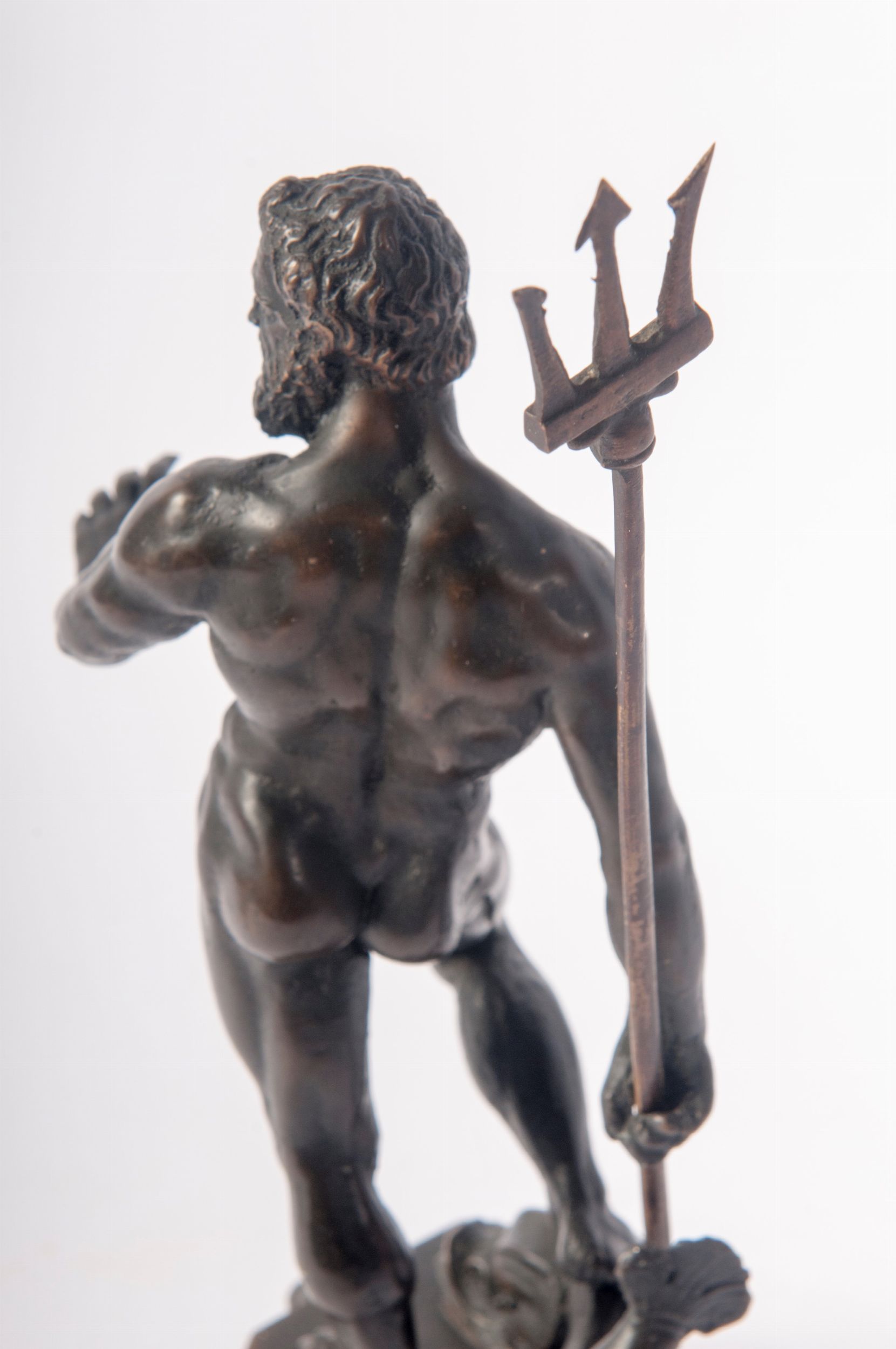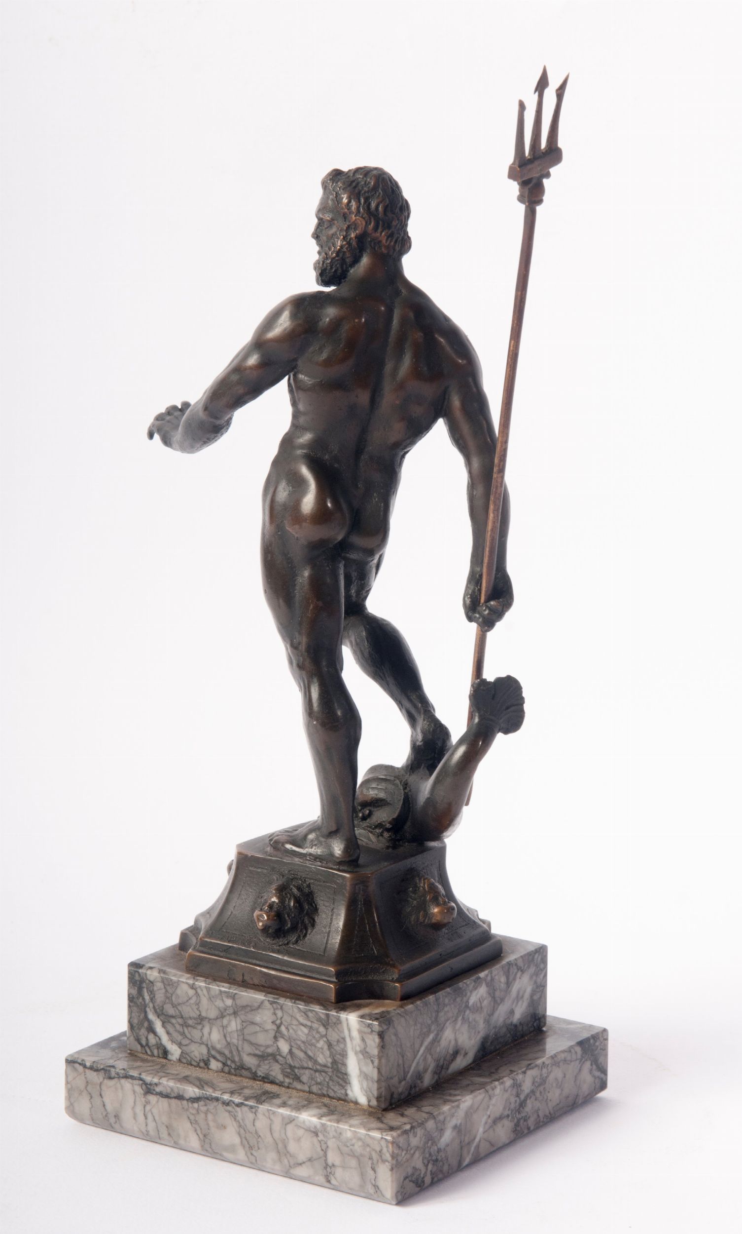 Firenze, XVIII secolo Bronzo, patina, 21 x 6,5 x 7,5 cm. Con base in marmo, non pertinente (misure con la base 26 x 11 x 11 cm). La Scultura in bronzo qui presentata è replica del Nettuno posizionato sull'omonima fontana, a Bologna. La realizzazione della suddetta fontana fu commissionata al grande scultore fiammingo Giambologna che si avvalse dell'opera del fonditore bolognese Zanobio Portigiani. L'imponente monumento fu completato nel 1566 e, oltre alla scultura del Nettuno, comprende una struttura in marmo e gruppi di figure allegoriche in bronzo, quali Nereidi e putti con delfini. Il nostro bronzetto ripete solamente la figura apicale del Nettuno, con il tridente in mano, e poggia il piede sinistro sulla testa di un delfino. Conservato nel Museo Medievale di Bologna il bozzetto dell' imponente scultura. Questo bronzo rappresenta la prima idea per il colosso poi realizzato con alcune varianti, quali soprattutto la lunghezza della barba. Nel bozzetto la barba era molto lunga, nell' opera finita viene accorciata. Enorme fu il successo di questa opera a tal punto che, quasi simbolo della città , fu replicata sin dagli esordi in vari materiali. Talvolta si reperiscono sul mercato fusioni 8-9centesche del Nettuno, di qualità discreta ma industriale. La replica qui presentata è senz'altro ascrivibile al XVIII secolo e potrebbe rientrare nella migliore produzione Grand Tour, quando i ricchi viaggiatori internazionali amavano riportarsi in patria repliche Dei maggiori monumenti italiani. Notiamo la resa del viso barbuto estremamente convincente e simile all' originale, nonché la lavorazione delle mani e dei piedi, così vicina ai modi del Giambologna, dalle tipiche unghie quadrate. Pure la patina intensa e coprente è tipica di quelle produzioni. Bibliografia: Charles Avery-Antony Radcliffe, Giambologna Sculptor of the Medici, Catalogo della mostra ( Edimburgo, Londra e Vienna), 1978-79, p.12.