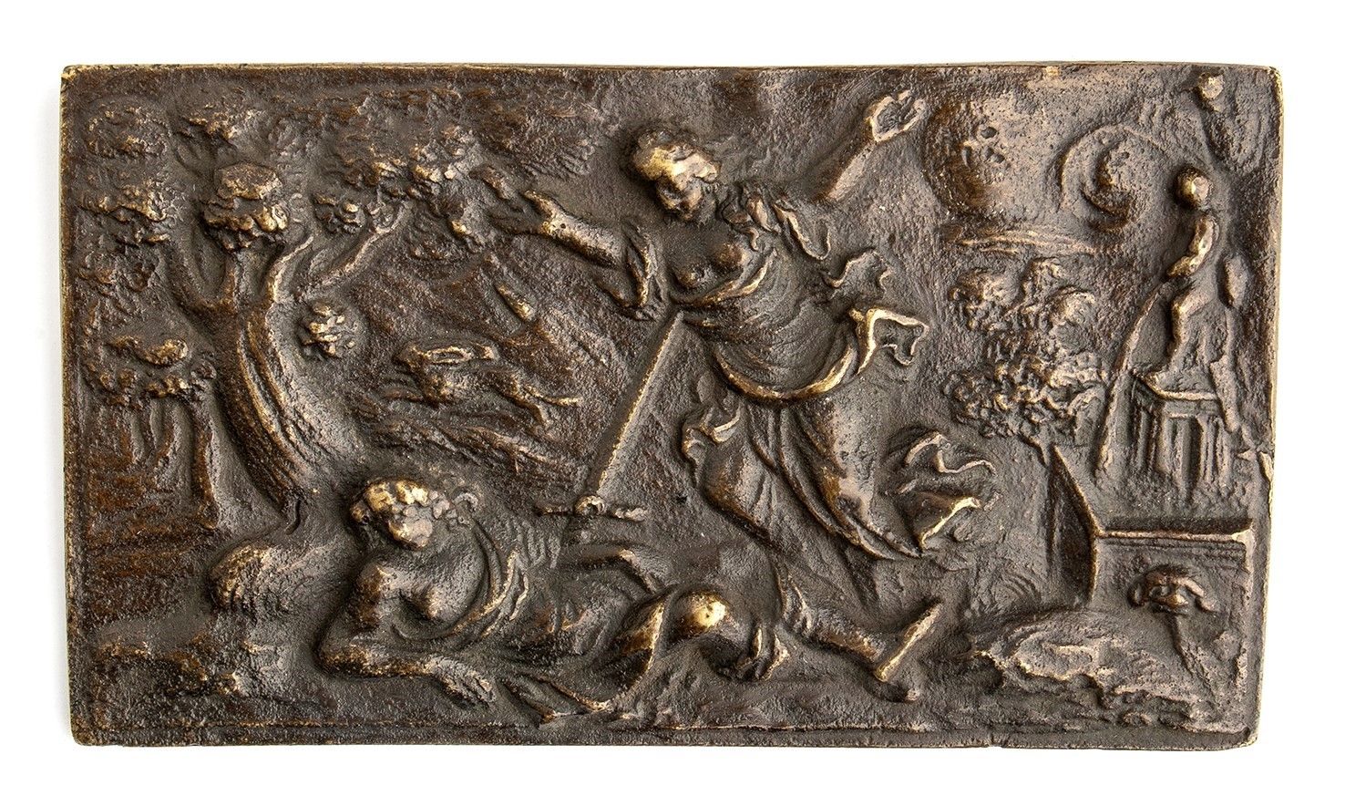 Scuola tedesca XVII secolo Placchetta rettangolare in bronzo con patina marrone; mm 124,5 x 70,2; gr 220,2. Piramo giace morto sotto gli alberi, mentre Thisbe cade sulla spada con le braccia aperte. A destra, un pozzo e una figura maschile mentre nell’atto di urinare; a sinistra, tra alberi, un coniglio in corsa; sullo sfondo, il mondo e la luna?. Bellissima fusione coeva Bibl. Weber 1975, p. 355, n 860\10; Walcher von Molthein 1926, n. 374