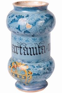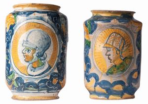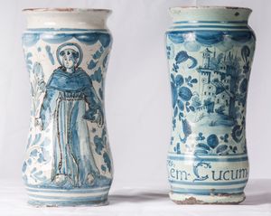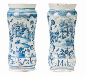 Officine campane FINE XVII - INIZIO XVIII SECOLO Albarelli in ceramica; 25,5 x 10,5 x 9,5 cm; 25 x 11,5 x 10 cm. [..]