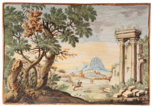 CASTELLI D'ABRUZZO FINE XVIII SECOLO Piastra di forma rettangolare, 19,5 x 29 x 1,5 cm. Decoro con paesaggio con [..]