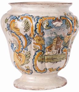 AREA MARCHIGIANA, XVIII SECOLO Ceramica policroma; cm 26 x 21 x 9. Corpo emisferico con quattro prese laterali [..]