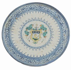 FAENZA, FINE XVI-INIZIO XVII SECOLO Ceramica, 24 x 5 cm; 41 x 10 cm (con cornice). Con corta balza ed ampio fondo [..]