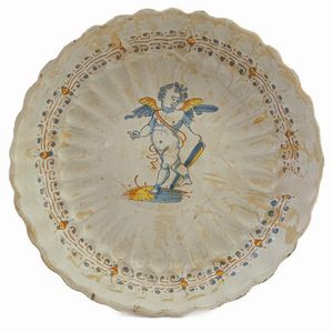 diametro 24,7 x 5,7 x 9,7 Deruta, seconda metà XVII secolo Ceramica policroma, 24,7 x 5,7 x 9,7 cm.  [..]
