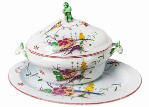 BOLOGNA, TERZO QUARTO XVIII SECOLO Ceramica policroma; 23 x zuppiera 33 x 20,5 x 11,5 cm; vassoio 41 x 31,5 x [..]