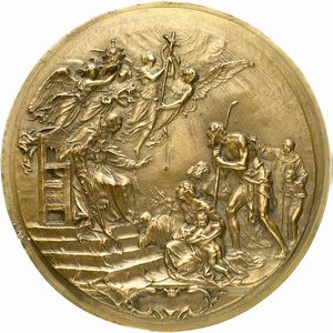 Roma XIX secolo Placca tonda in bronzo; mm 84,6; gr 15. Papa seduto in trono, con gli angeli che portano [..]