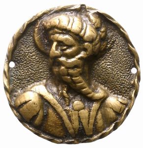 Scuola tedesca XVI secolo Placchetta tonda in bronzo dorato, due fori ai lati; mm 39,7; gr 24,3. Busto verso [..]