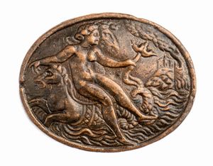 Area tedesca XVI secolo Placchetta ovale in bronzo con patina marrone; mm 28,67 x 22,71. Venere seduta su un mostro [..]