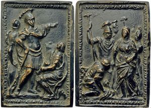 Officine romane XVIII secolo 1) Placchetta rettangolare in bronzo con patina marrone scuro; mm 78 x55; gr 119. [..]