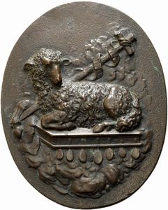 Fonderie italiane XVIII secolo Placchetta ovale in bronzo; mm 130,7 x 104, gr 327,9. Agnello mistico rivolto [..]