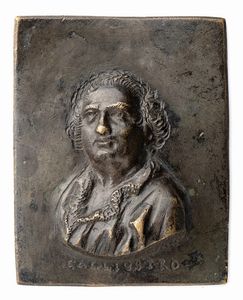 Italia inizio XIX secolo Placca rettangolare in bronzo con patina scura; mm 127 x 84. Con cornice in legno. D/ [..]