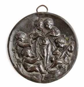 Scuola italiana inizio XIX secolo Placchetta tonda concava in bronzo con patina bruna; mm 152,9; gr 572,8. Cinque [..]