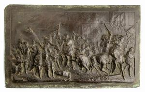 Scuola Italia centrale XIX secolo Placchetta rettangolare in bronzo con patina marrone scuro; mm 261 x 164; gr [..]