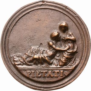 Italia XVIII secolo Placchetta tonda in bronzo; mm 77,2; gr 107. Donna che nutrisce un uomo sdraiato. Sotto scritta [..]