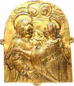 Scuola veneta XVI secolo Placchetta in rame dorato centinato, quattro fori; mm 123,4 x 107,3; gr 93,6. Abbraccio [..]