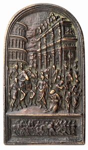 Scuola italiana XVIII secolo Placchetta in bronzo centinato, con patina marrone chiaro e tracce di doratura, un [..]