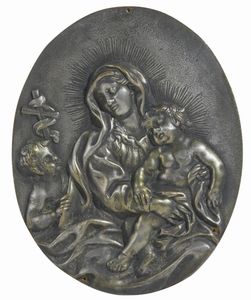Area genovese XVIII secolo Placchetta ovale in bronzo argentato; mm 200 x 160. Madonna e Bambino addormentati, [..]