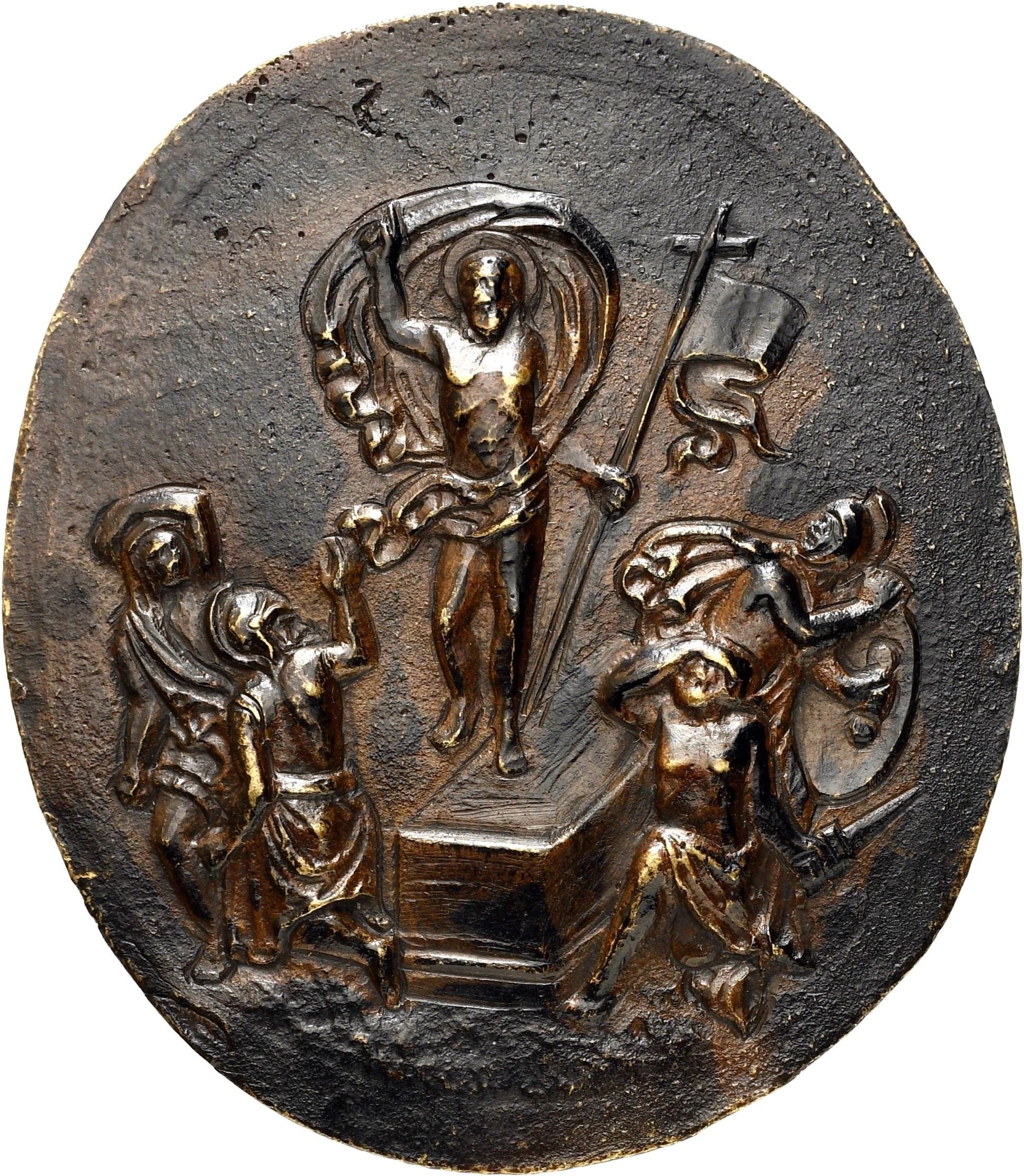 Placchetta ovale in bronzo con patina marrone scuro rossiccio; mm 59,1 x 51,4; gr 29,8. Cristo risorge con il vessillo, ai lati quattro soldati spaventati. Fondo liscio. Bellissima fusione antica. Bibl. Weber 1975, p.207 n. 400.4; Imbert\Morazzoni 1941, p.49 n. 52. Coll Storelli 2011, p.42, n. 32.