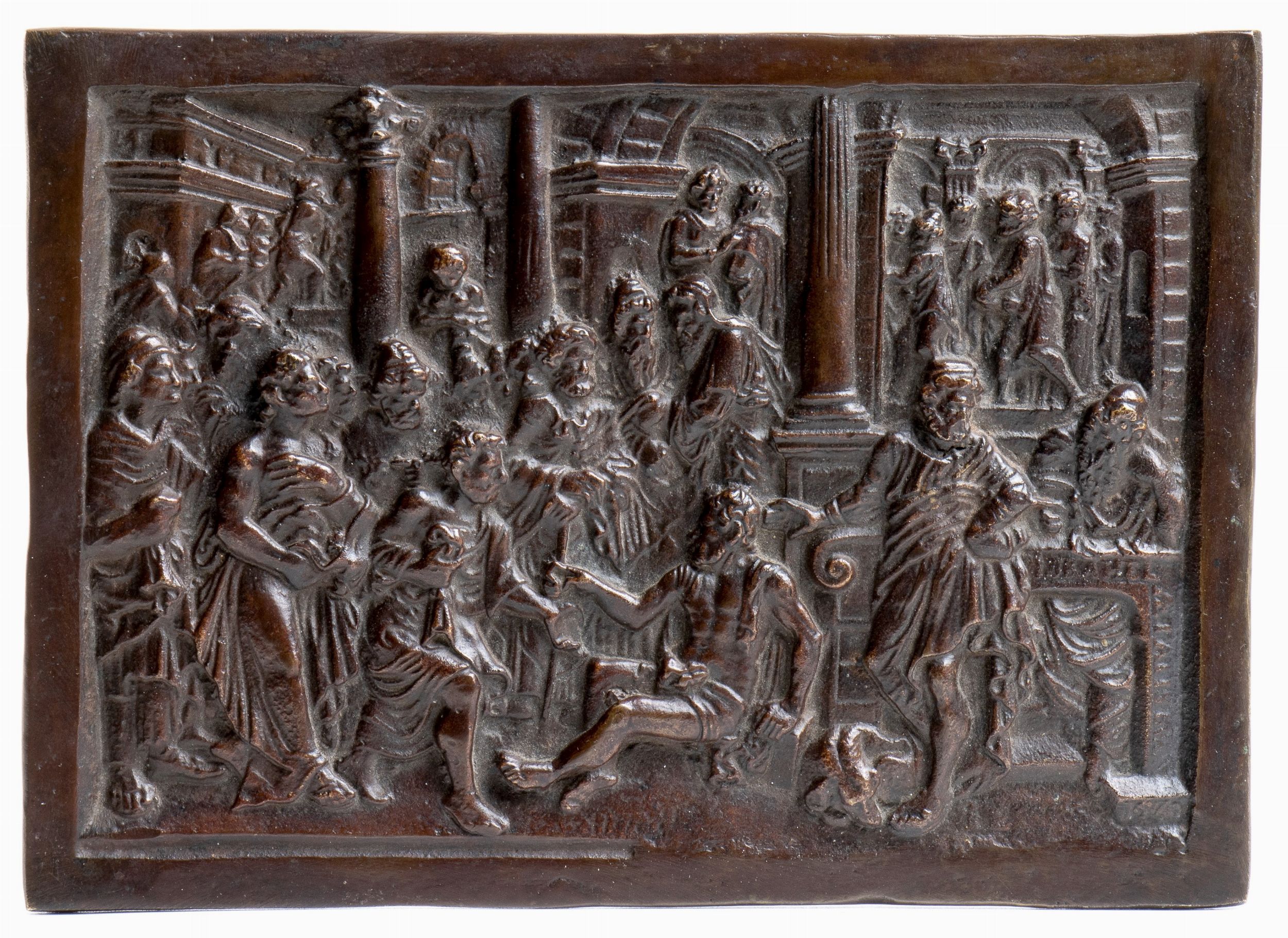 Officine italiane? XVII secolo Grande rilievo rettangolare in bronzo; mm 220 x 170; gr 1.657. Scena affollata all'entrata di un tempio, uno storpio seduto allunga una mano verso S.Pietro e S. Giovanni. a destra una figura maschile con lunga barba appoggiato ad un scrittoio in pietra su cui la scritta ISRAHEL AETATIS SV....; in basso nell'angolo destro sopra un cippo si intravede una data 1570?; sullo sfondo colonnati ed archi. Bordo piatto . Bella fusione antica e rara. Bibl. Geber A. vol. 22, Washington, 1989. Pp. 254 n 10.