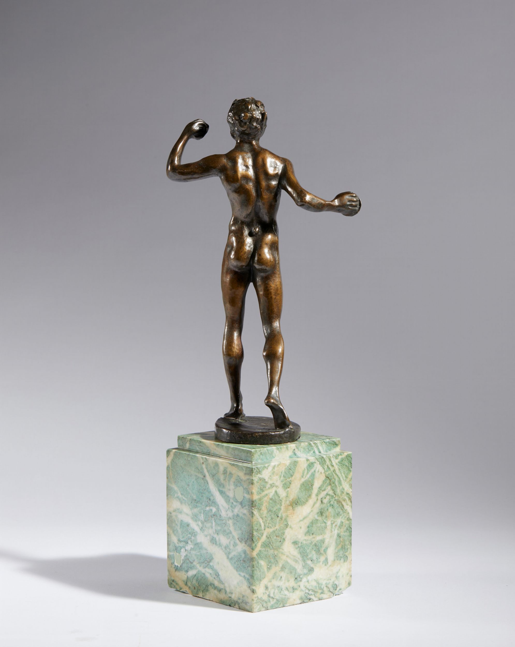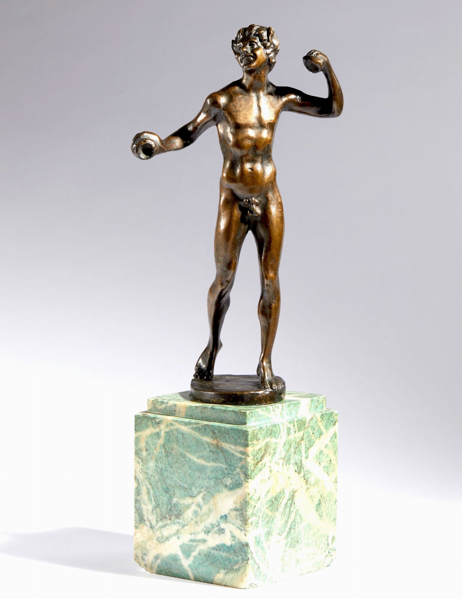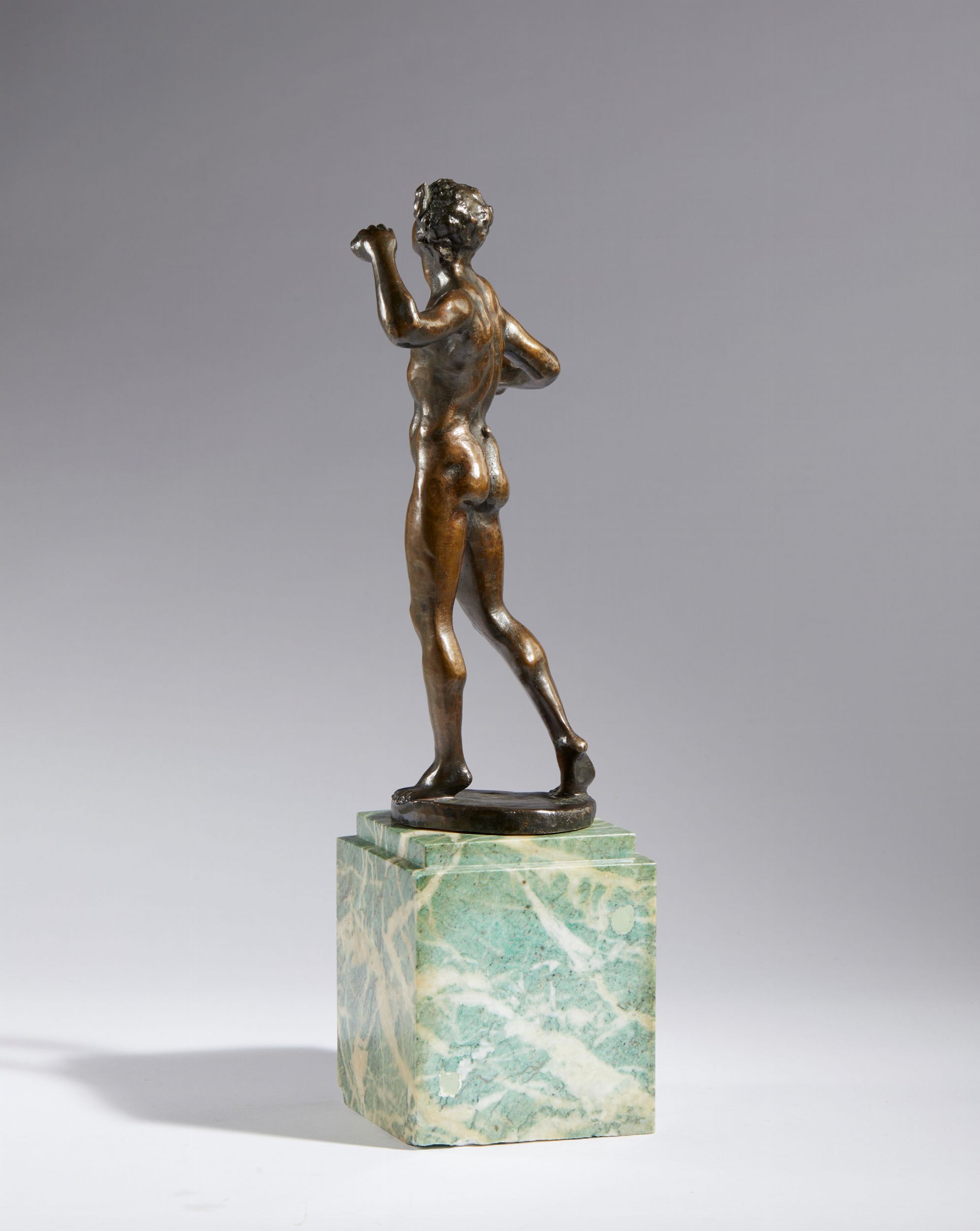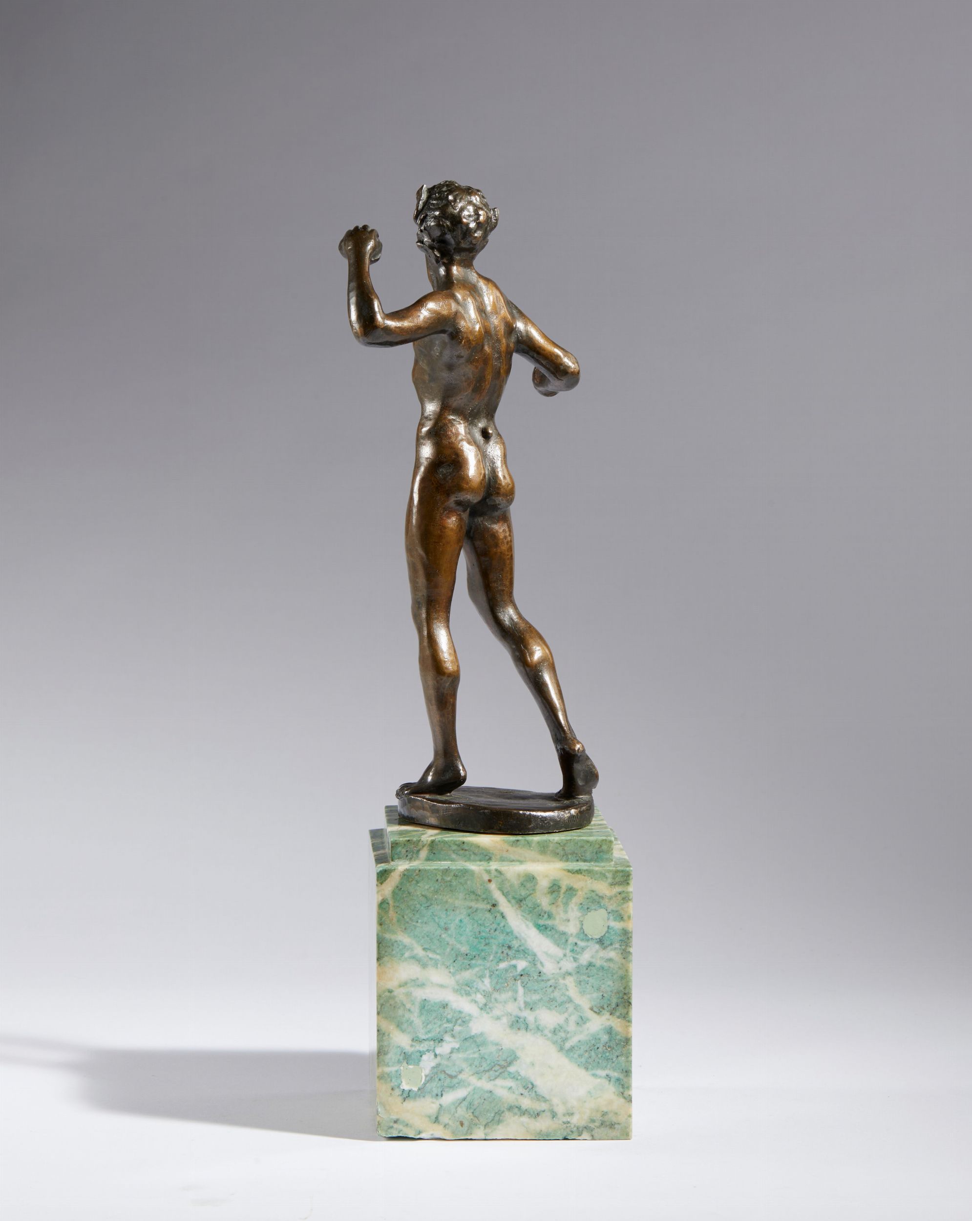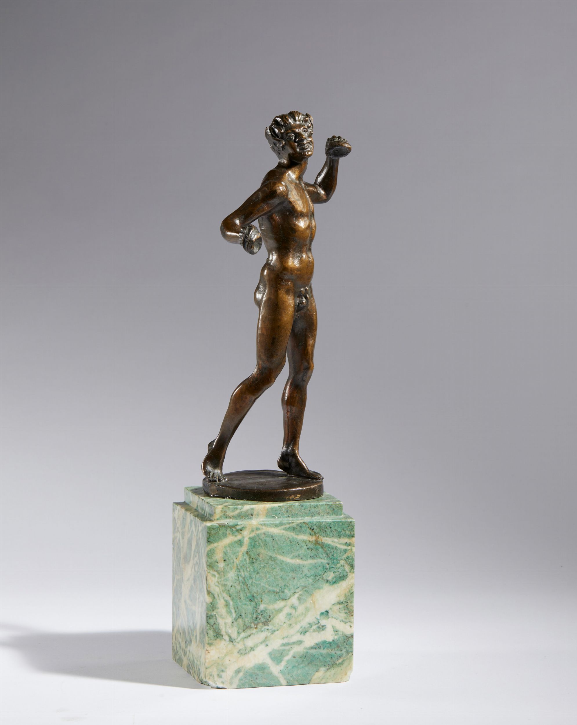 Bronzo patina trasparente rossastra; 37x10x10 cm. Pietro Simoni da Barga fu scultore di corte del cardinale Ferdinando de' Medici e realizzò per la sua prestigiosa committenza una serie di sculture in bronzo, spesso ispirate a originali archeologici e non solo. Circa una trentina delle sue opere sono oggi conservate al Museo Nazionale del Bargello a Firenze. Questi bronzetti presentano generalmente una pattina intensa, spesso arricchita da tracce verdognole, imitazione della patina archeologica. Nel Rinascimento, infatti, si tendeva ad emulare le opere antiche al punto di confondersi con esse. Il nostro Satiro appartiene a questo gruppo conservato al Bargello. Presenta una patina verde con tracce di doratura a fuoco. Una copia mutila della mano sinistra è conosciuta nella Galleria Franchetti alla Ca' d'Oro, Venezia, mentre poche altre repliche si trovano in altri musei. L'originale risulta essere evidentemente la statuetta del Bargello, ma le altre copie, databili tra il XVII e XVIII secolo, rappresentano comunque derivazioni di pregio. La nostra in particolare presenta un modellato convincente e di guizzo, sostenuto da una splendida patina trasparente rossastra, tipica delle produzioni toscane antiche, su tracce più scure. Inoltre, il bronzo risulta tamburellato per creare più 'movimento' sulla pelle della sculturina, caratteristica preziosa spesso rinvenuta sulle fusioni veramente antiche. Bibl. Beatrice Paolozzi Strozzi, Museo Nazionale del Bargello-Bronzetti dal XVI al XVII secolo, S.P.E.S, Firenze, 1989.