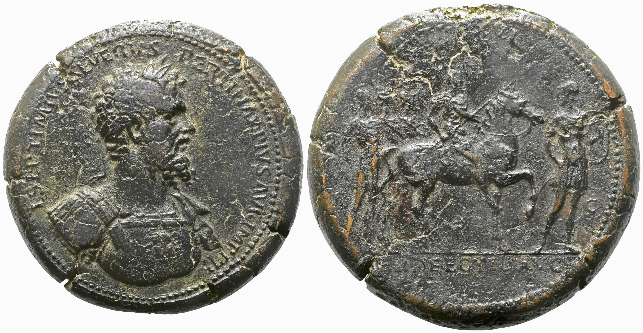 Scuola romana sec. XVIII Medaglione di fantasia in bronzo; mm 46,3. D/ Busto di un imperatore a cavallo Septimio Severo (Il ritratto è piu somigliante a Pertinace) R/ Imperatore a cavallo con altre due figure