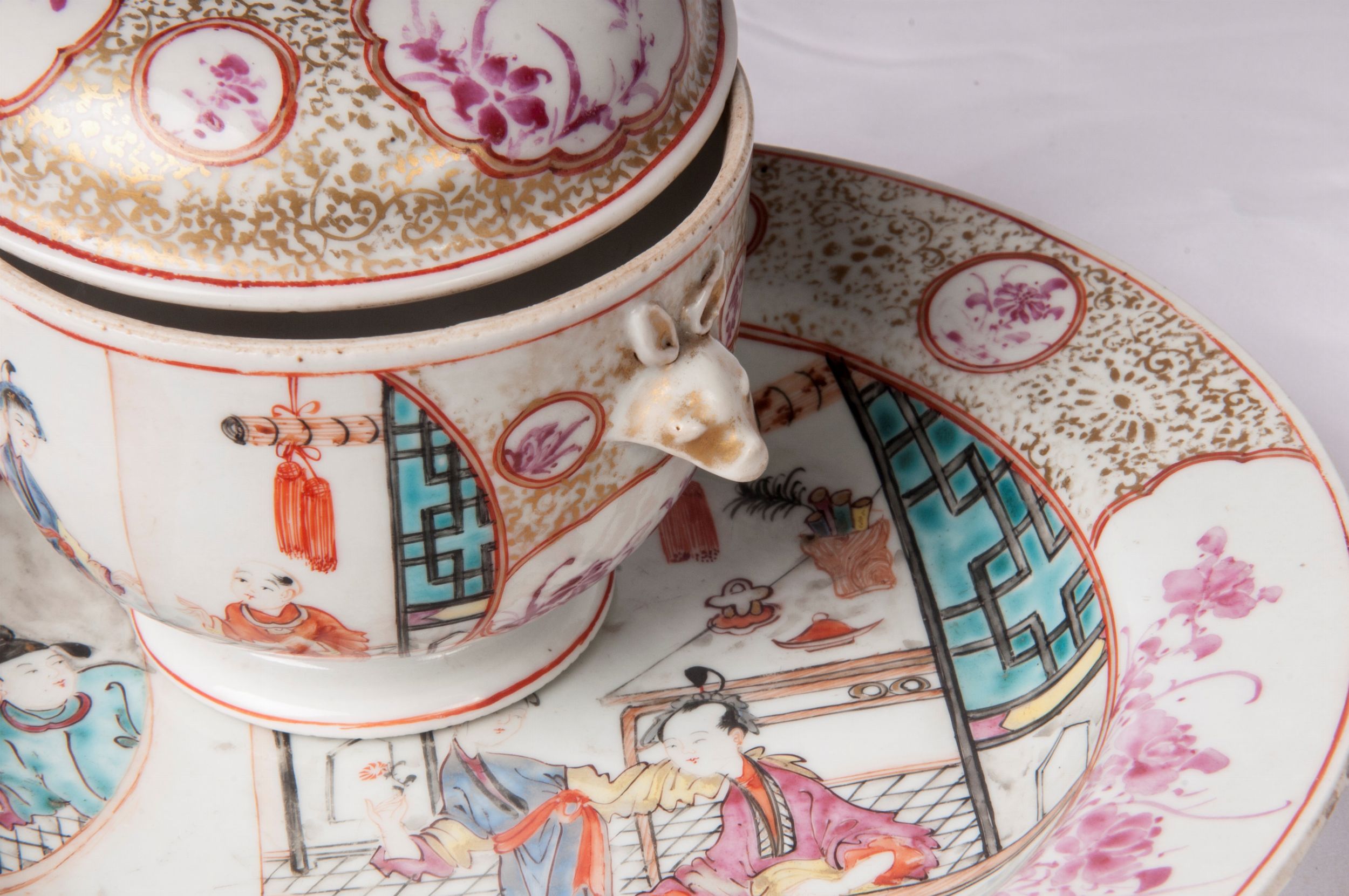 CINA, CANTON, FINE XVIII SECOLO Porcellana policroma, tazza 11 x 10,5 x 6,5 cm; piatto 22,5 x 4,5 cm. Tazza cilindrica con prese a teste di animali, dal corto collo e piede svasato. Coperchio a calotta con presa a figura di animale. Decoro su fondo bianco con scene tratte dal repertorio dell' estremo oriente entro riserve porpora. Sul coperchio fiori entro riserve rosse a fondo bianco separate da graticcio dorato. Piatto a scodella dalla corta tesa e fondo a tutto campo con appoggio ad anello su fondo ribassato. Decoro del piatto en suite con la tazza. Stato di conservazione: buono, usure alle dorature come da uso nel tempo.