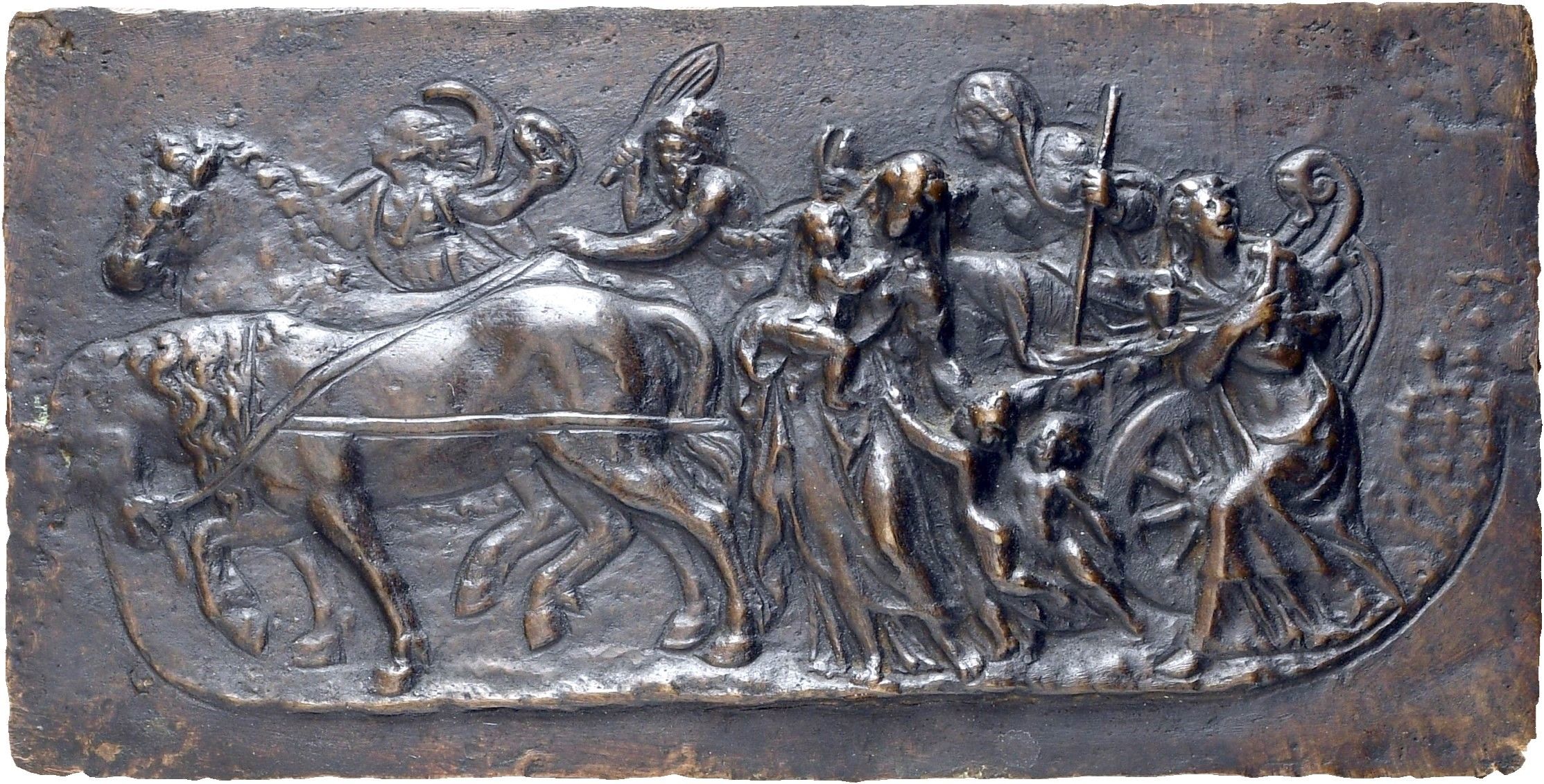 Scuola olandese XVI-XVII secolo Placchetta rettangolare in bronzo con patina scura; mm 122,6 x 63,7. Carro trainato da due cavalli guidato da un uomo barbuto; davanti al carro, le figure della Carità e della Fede con fanciulli e con croce e pisside; in secondo piano, sopra ad un cavallo, la Speranza, che tiene un’ancora e una piccola corona. Fusione antica. Rif. Toderi –Vannel 1996, 349\50; Rossi F. 1974 pp. 158 n. 266; Rossi F 1984, pp. 240 N 89.