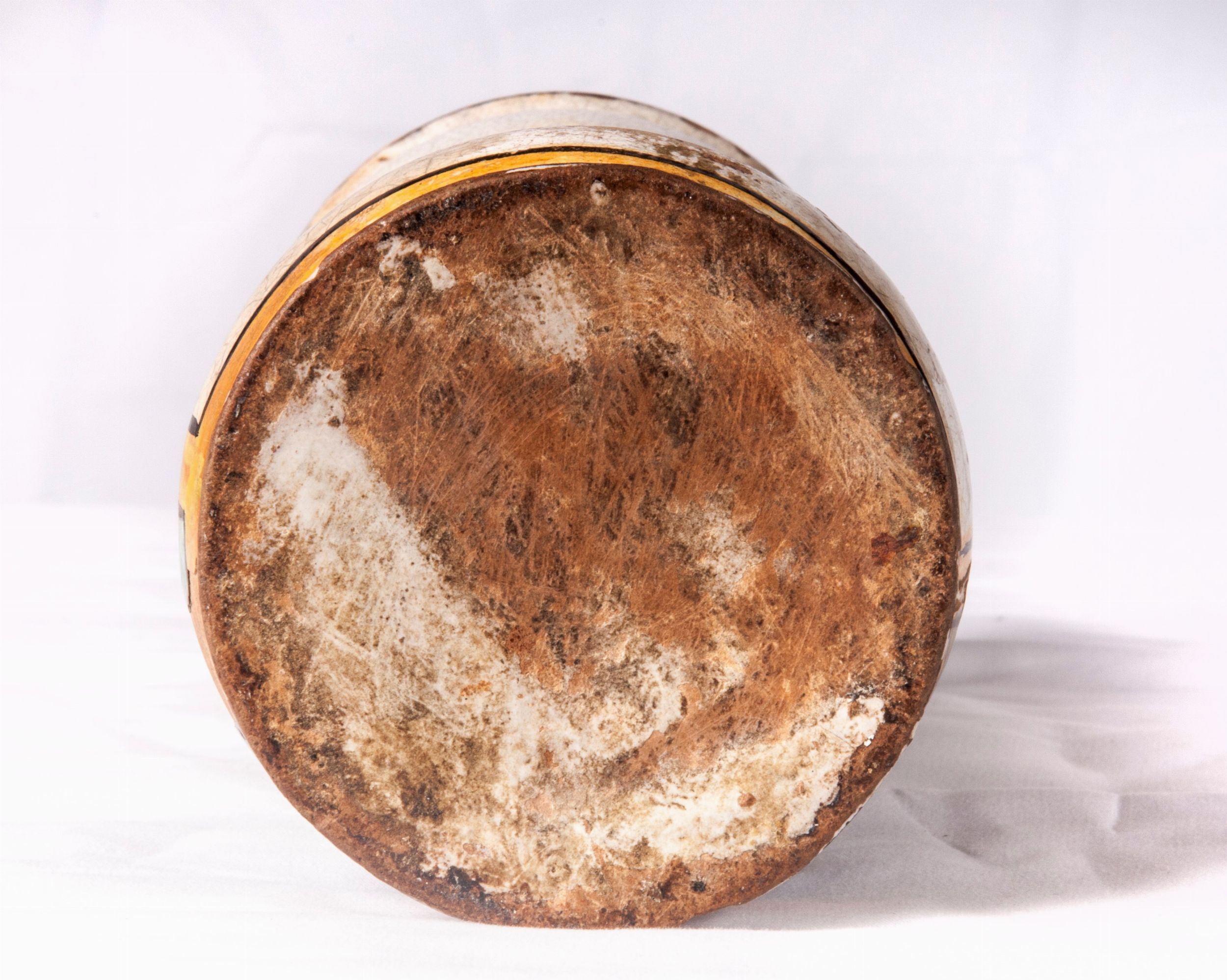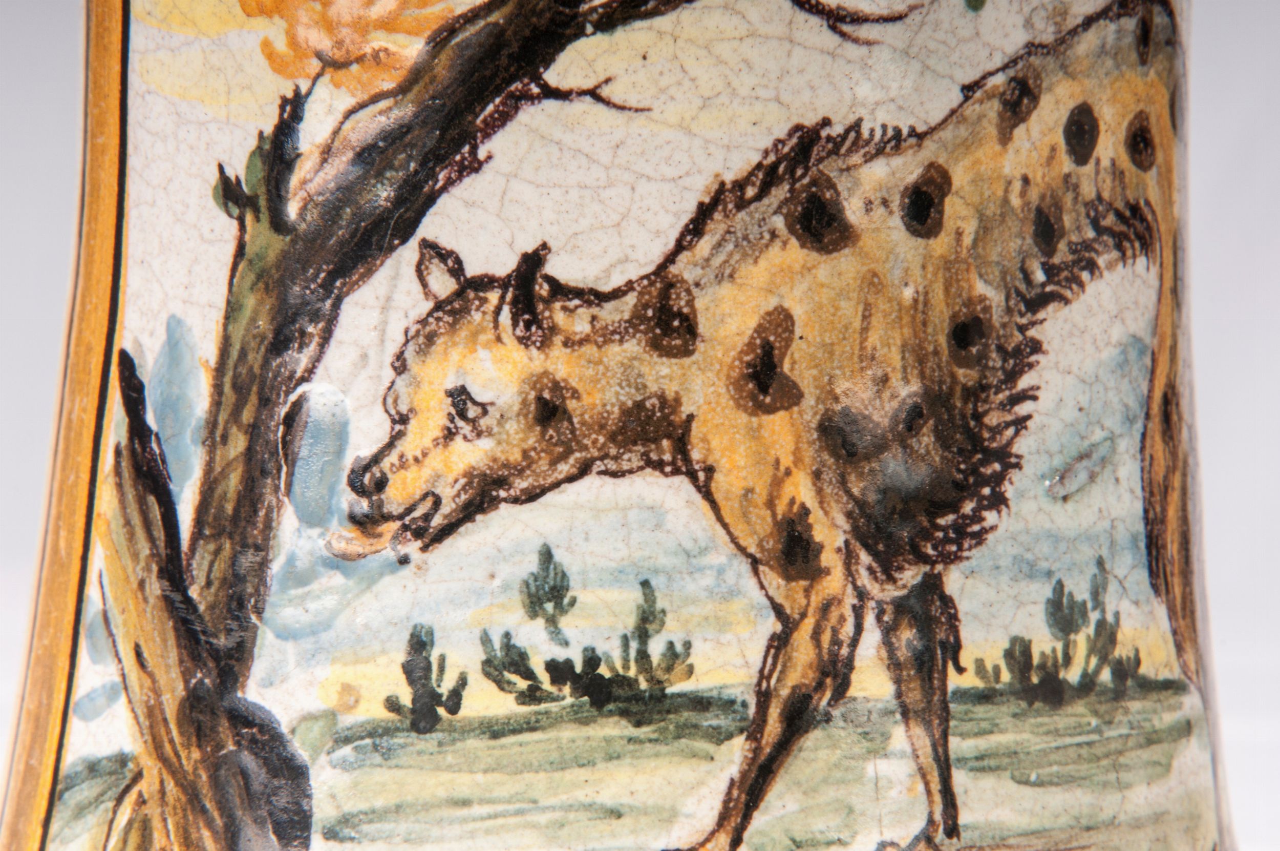 AREA ABRUZZESE Seconda metà XVIII secolo Ceramica; cm 25 x 11 x 9,8. Dal corpo leggermente rastremato al centro con spalla e base arrotondata. Orlo superiore estroflesso e base a disco tagliata alla stecca. Foggiatura al tornio. Decoro in policromia con scena di paesaggio e lupo entro riserva bordata in ocra, alla base iscrizione 'lupo cerviero' . Posteriormente iniziali con data in bruno di manganese. Manifattura abruzzese probabilmente Torre dei Passeri. Stato di conservazione: diversi punti con caduta dello smalto nel corpo ed orlo superiore restauro in due punti. Piccole mancanze all'orlo del piede