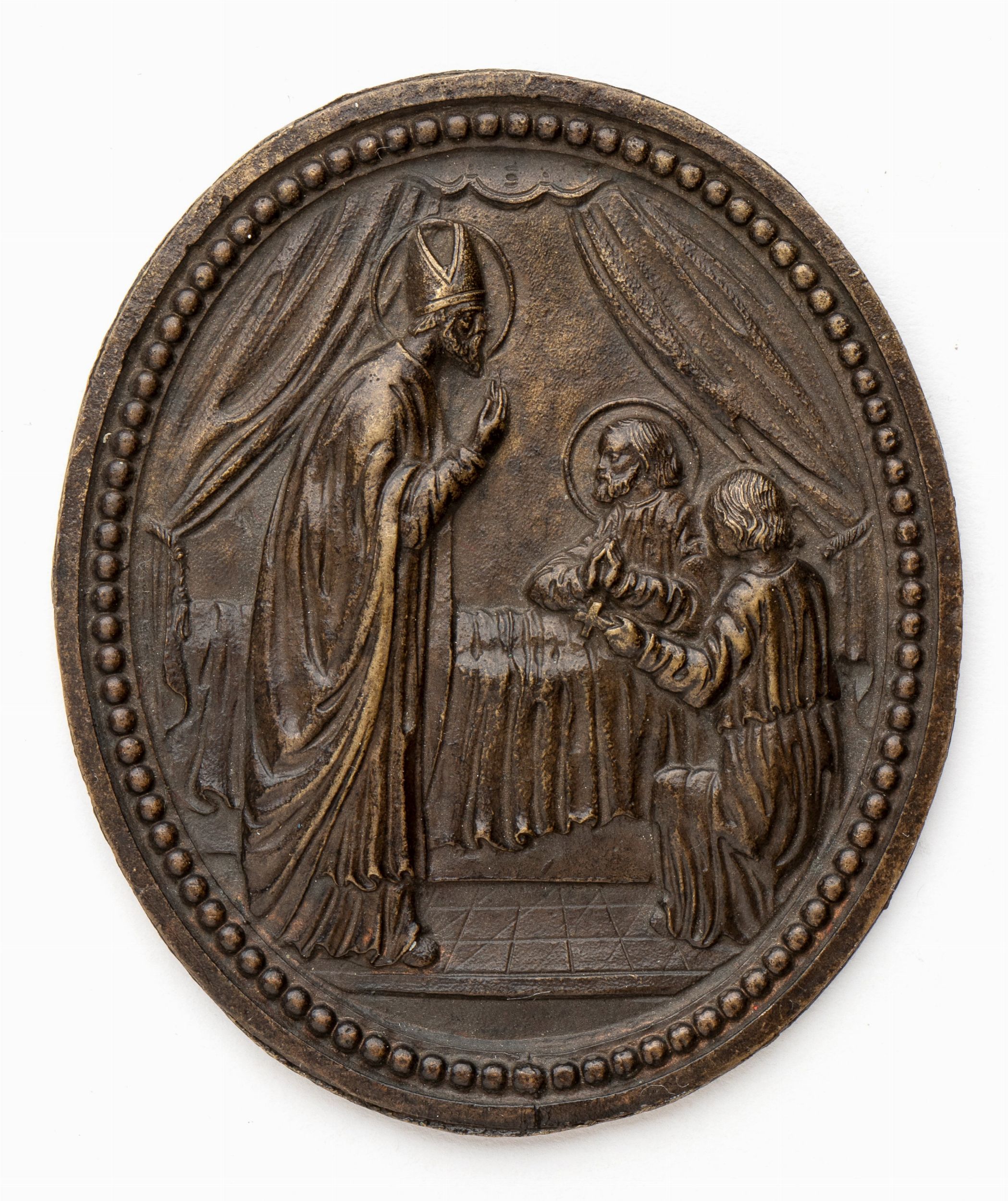 Scuola francese XIX secolo Placchetta ovale in bronzo con patina marrone; mm 63,5 x 54. Vescovo somministra il viatico a un santo sacerdote, assistito da un chierico