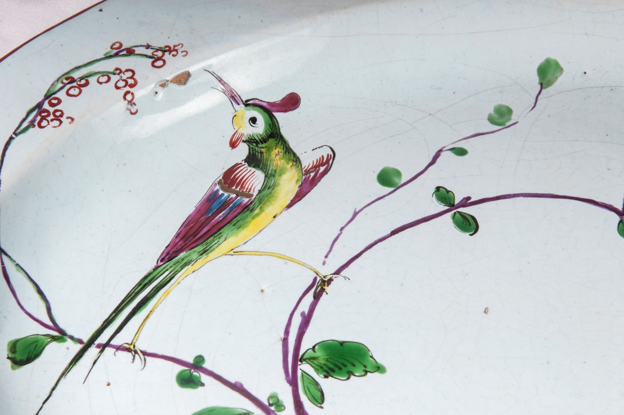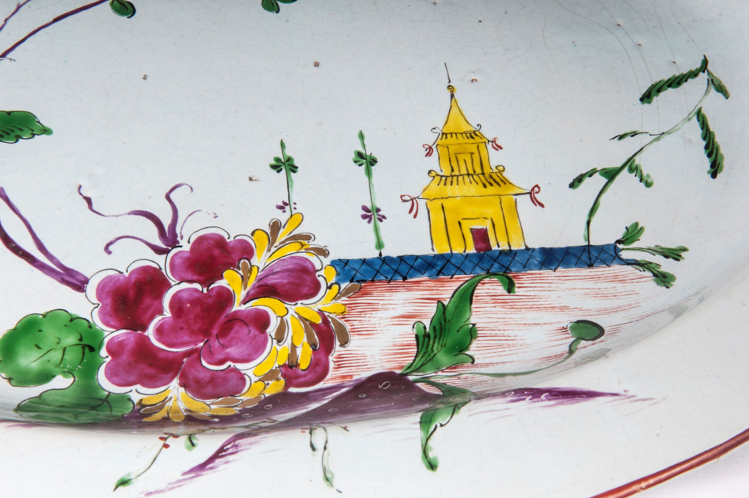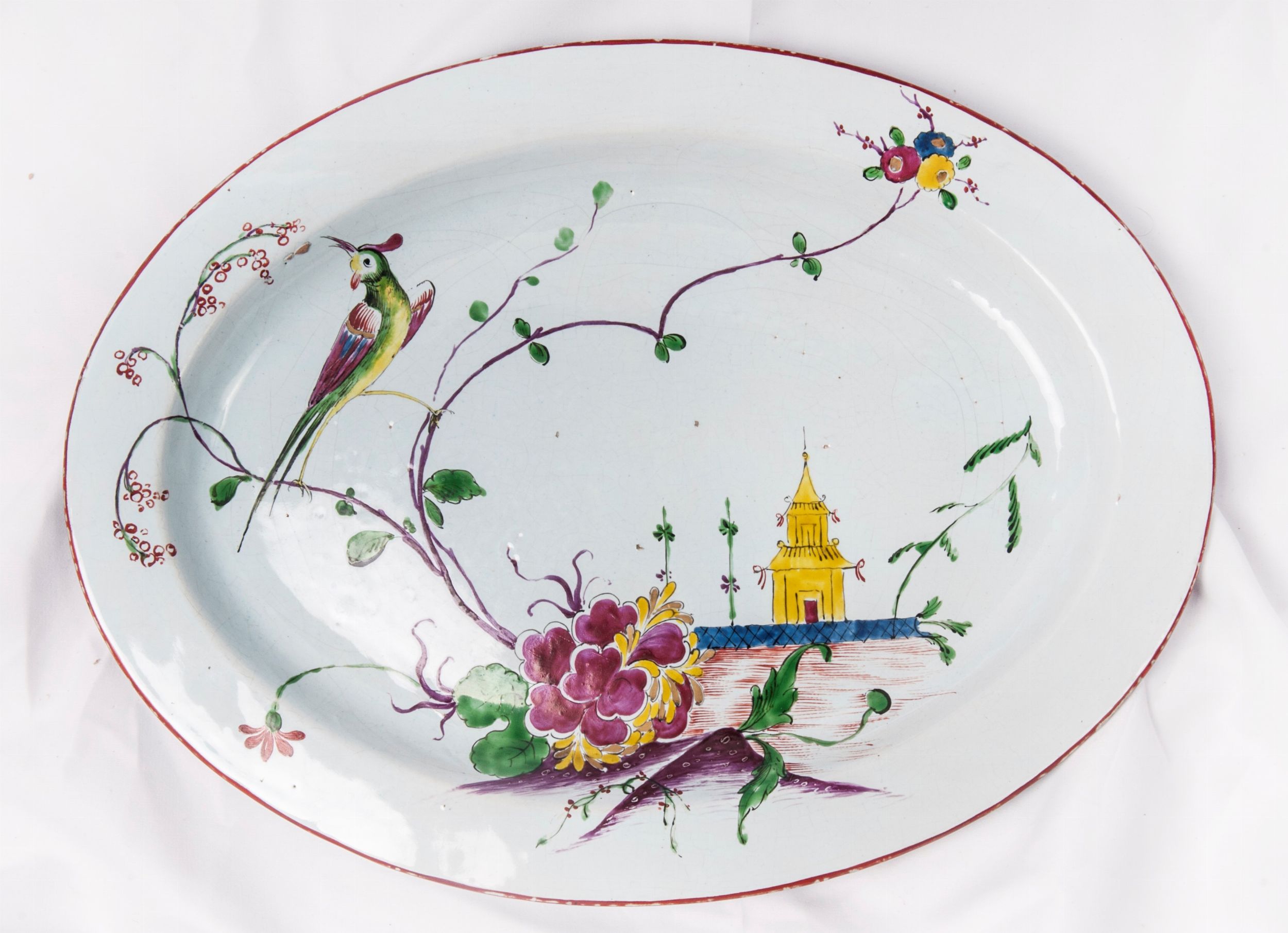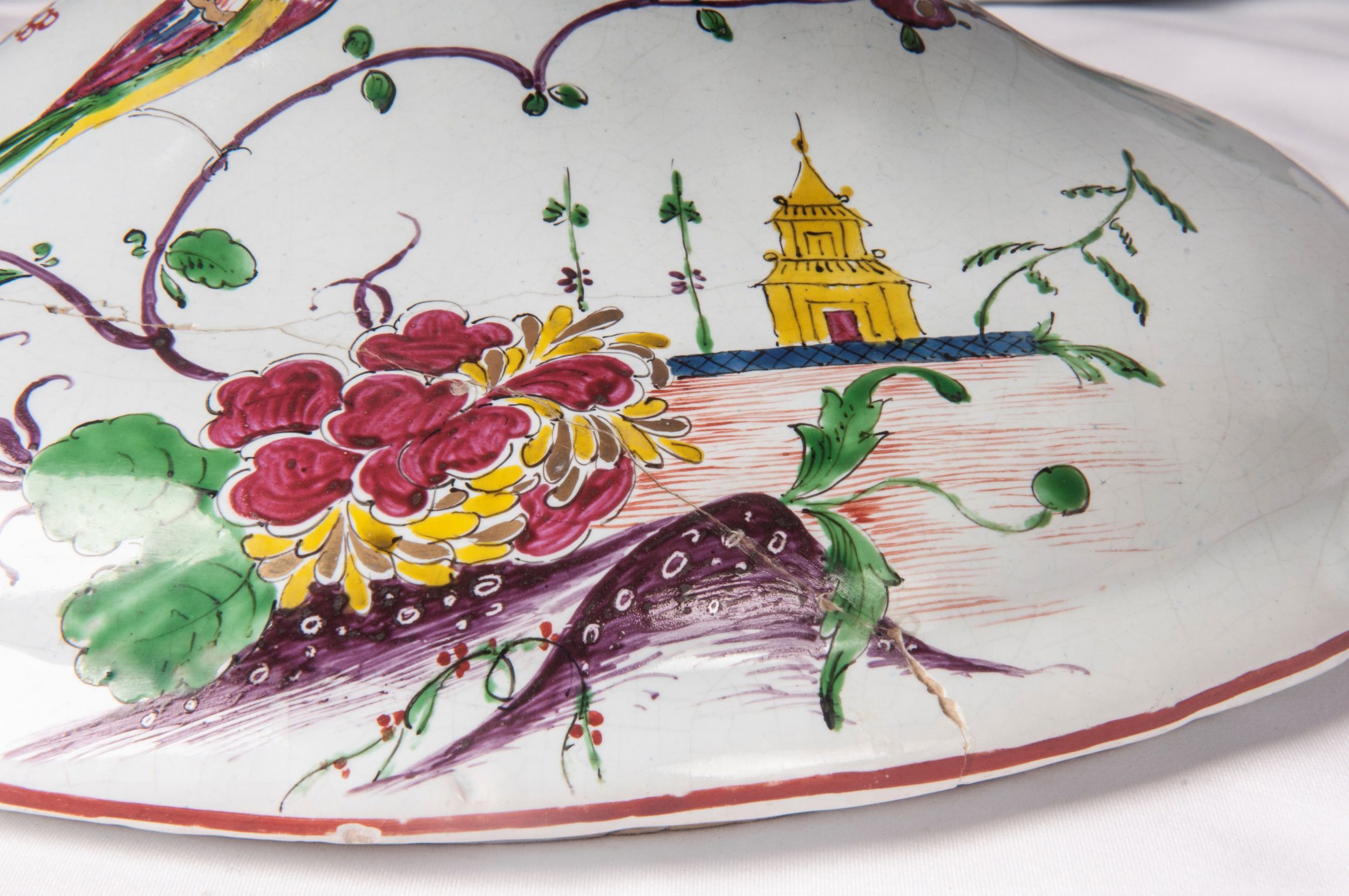 BOLOGNA, TERZO QUARTO XVIII SECOLO Ceramica policroma; 23 x zuppiera 33 x 20,5 x 11,5 cm; vassoio 41 x 31,5 x 3 cm. Forma ovale con impugnature a virgola e presa del coperchio a forma di putto. Corpo liscio arrotondato sulla spalla, leggermente rastremato al centro, appoggio con piano ribassato, coperchio a calotta. Decoro floreale con edifici alla cinese ed uccelli nelle cromie verde ramina, blu cobalto, arancio, porpora e giallo d'antimonio. Bordo del coperchio e delle zuppiera profilati in porpora. Vassoio di forma ovale dalla corta tesa, ripida balza ed ampio fondo en suite con la decorazione della zuppiera. Nel retro sotto smalto la segnatura puntata della manifattura Giuseppe Fink, Bologna. Stato di conservazione: molto buono, tranne il coperchio della zuppiera che presenta delle rincollature.